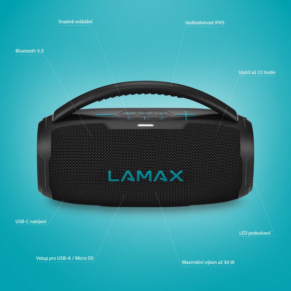 Dej svojí party pořádnou šťávu nebo si jen užij svoje oblíbený songy na maximum. Reprák LAMAX PartyGo1 Mini tě v tom podpoří až 30W výkonem. Užívat si jeho parádní zvuk můžeš doma, při sportu nebo v partě kámošů, protože ho jednoduše chytíš za madlo a jdeš. Baterie tomuhle fešákovi vydrží až 22 hodin a ani rozmary počasí ho díky krytí IPX5 nezastaví. V balení máš taky mikrofon, abys mohl uspořádat nezapomenutelný karaoke mejdan. Až 5 nastavitelných LED efektů ještě umocní dojem a vytvoří super atmošku. Reprák nabízí širokou variabilitu připojení, ale nejvíc určitě využiješ nejnovější Bluetooth 5.3 přes který se automaticky spáruje se zařízením. Ještě je dobrý vědět, že podporuje kodeky AAC a SBC, no a když mu dojde dech, dobiješ ho přes USB-C. Tak dej svým dnům pořádný grády, parťáka už máš.