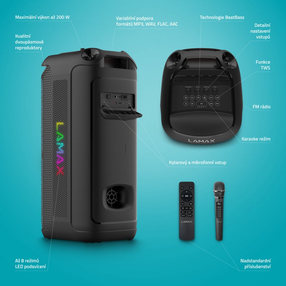 LED podsvícení, FM rádio, TWS, bezdrátový mikrofon, BeatBass technologie, dálkový ovladač, karaoke režim, nahrávání