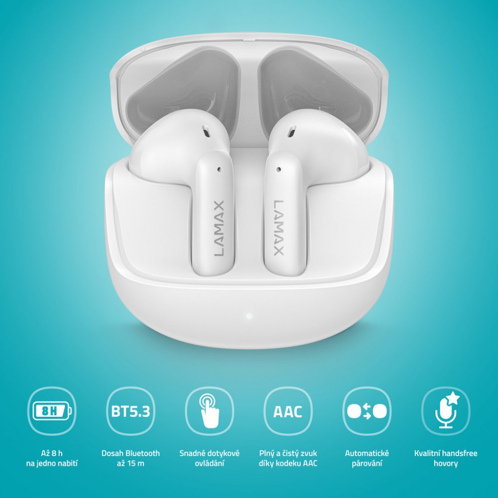 Bezdrátová sluchátka LAMAX Tones1 jsou našlapaný pecky od LAMAX! S rychlým Bluetooth 5.3 připojením a dosahem až 15 metrů si můžeš užívat svobodu pohybu a poslechu až 8 hodin na jedno nabití. Extra šťávu na dalších 32 hodin máš s sebou v pouzdru. Užij si parádní zvuk kdykoli a kdekoli, ať už při práci nebo legraci. Kvalitní mikrák pro hovory i ovládání nesmí chybět, tak mačkej play a vyraz ven!