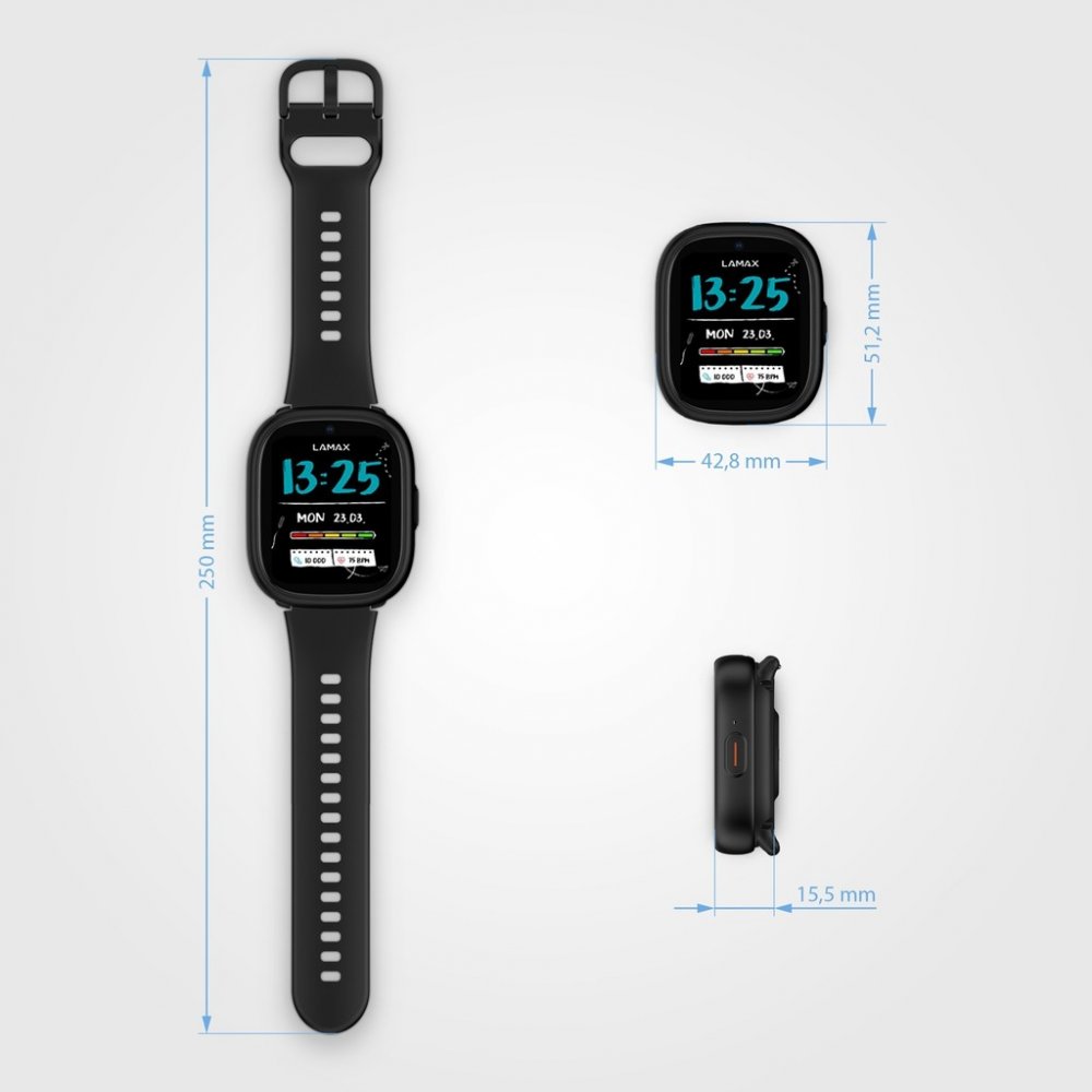 LAMAX dětské 1.7 palce TFT LCD hranaté 240 x 280 px 52 g 42.8 mm 51.2 mm 42.8 mm 15.5 mm na Nano SIM přes GPS v hodinkách kombinované vlastní OS výrobců pro aktivního sportovce pro vícedenní používání 3 dní 680 mAh 3-7 dní Li-Po bez podpory plateb přes SIM kartu Gorilla Glass IP67 Water resistant hodinky, nabíjecí kabel, návod, 2× řemínky, 2× kryty