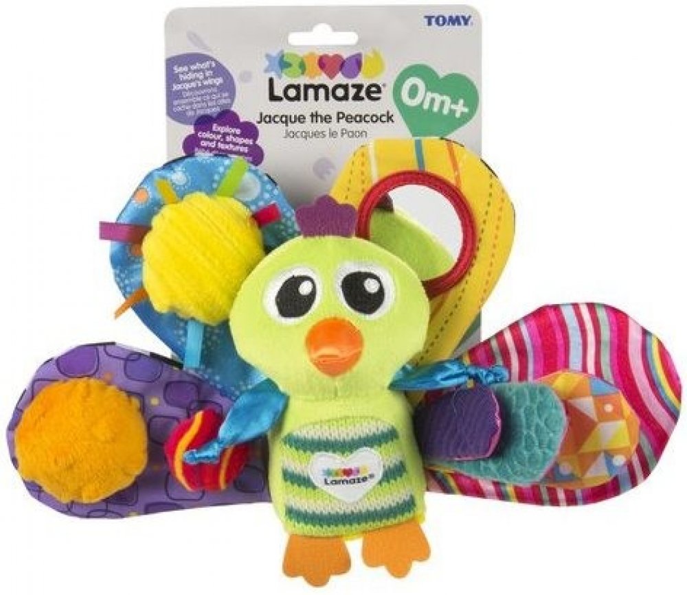 LAMAZE páv Emil nový od narození Páv Emil je vyroben z mnoha různých materiálů, které stimulují hmatové receptory. Pestré barvy a černobílé kontrastní vzory pak napomáhají rozvíjení zraku. V ocasu má ukryty pískátka, chrastítka a zrcátko pro hru „na jukanou". Charakteristický tvar pavích očí využívající efektu upoutává dětskou pozornost a podporuje rozvoj koncentrace. Ocas a křídla příjemně šustí....