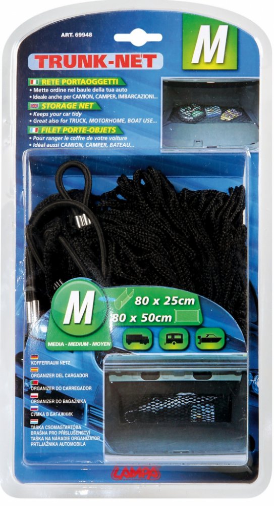 Síť do kufru velikosti M 80 x 50 cm nebo 80 x 25 cm od italské firmy Lampa Italy. Síť lze použít na dno kufru nebo se na zadní stranu sedadel.Sít’ do zavazadlového prostoru slouží k uchycení zavazadel a doplňků při přepravě, včetně 4 ks montážních úchytů montáž pomocí suchého zipu nebo šroubků.Rozměry : na dno kufru 80 x 50 cm nebo síť lze přeložit na půl ( jako kapsu) 80 x 25 cm