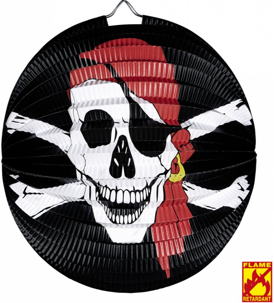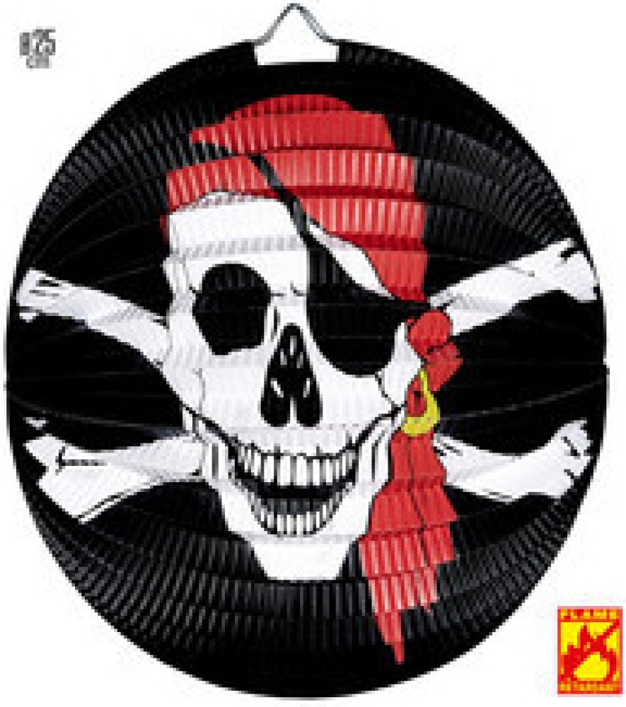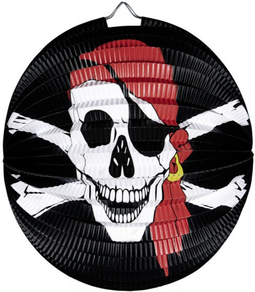Černý lampion s barevným motivem piráta má po rozložení tvar koule o průměru 25 cm. Má závěsné poutko.