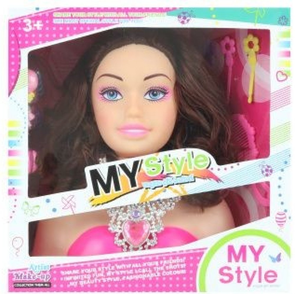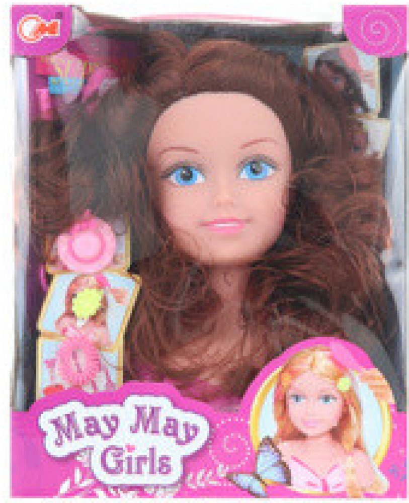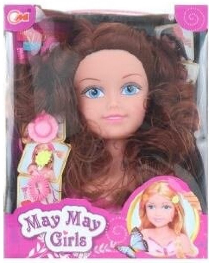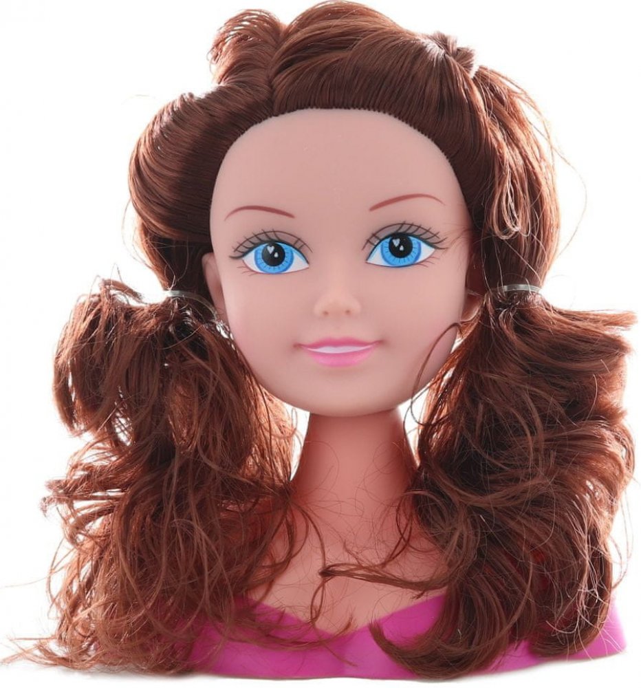 Česací hlava o rozměru cca 17 x 22 x 9 cm a gumičky, spirálky na vlasy, sponky, hřebínek a jiné doplňky.