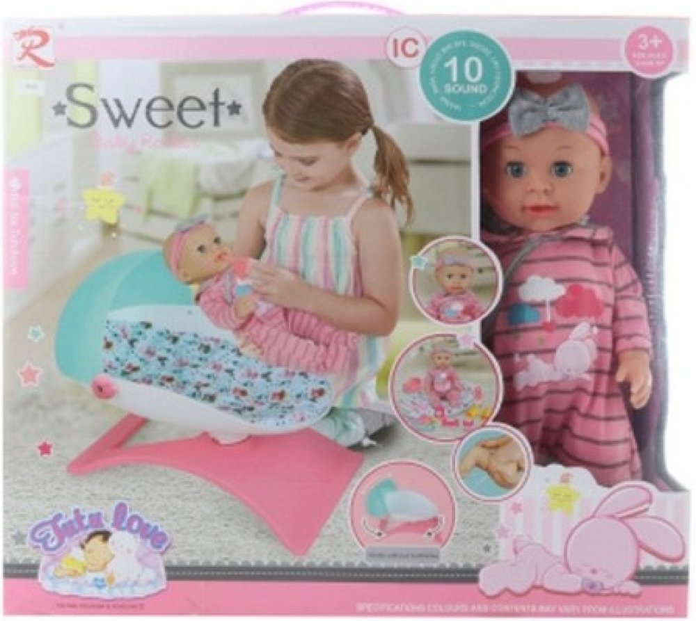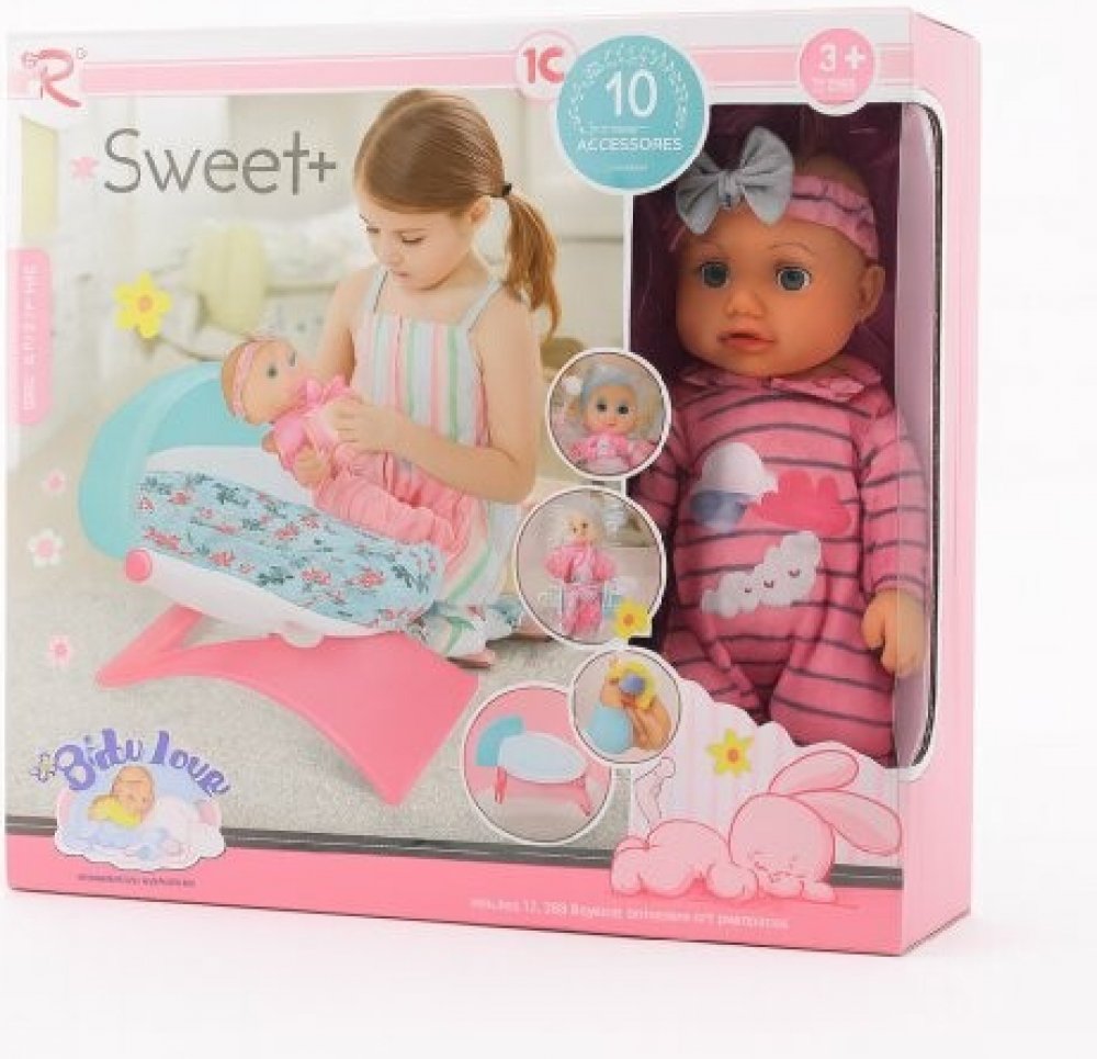 Balení obsahuje také botičky pro panenku, plastový bryndáček, lahvičku, talířek a další doplňky.