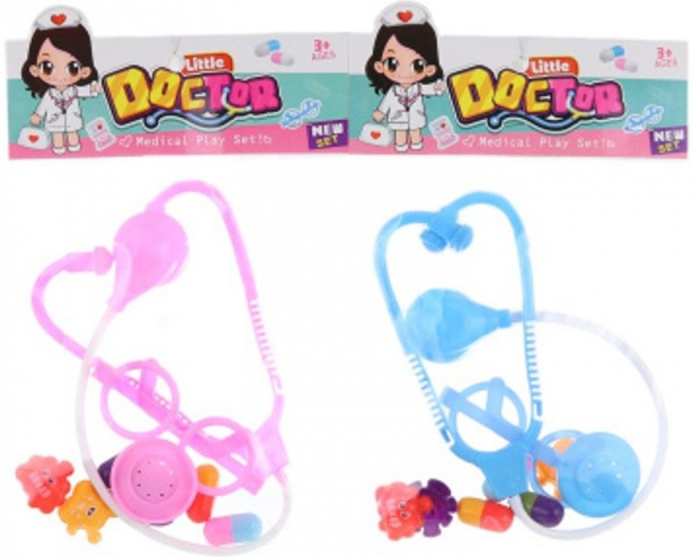 Plastová doktorská sada obsahuje stetoskop, brýle, 3 pilulky a 3 bakterie.
