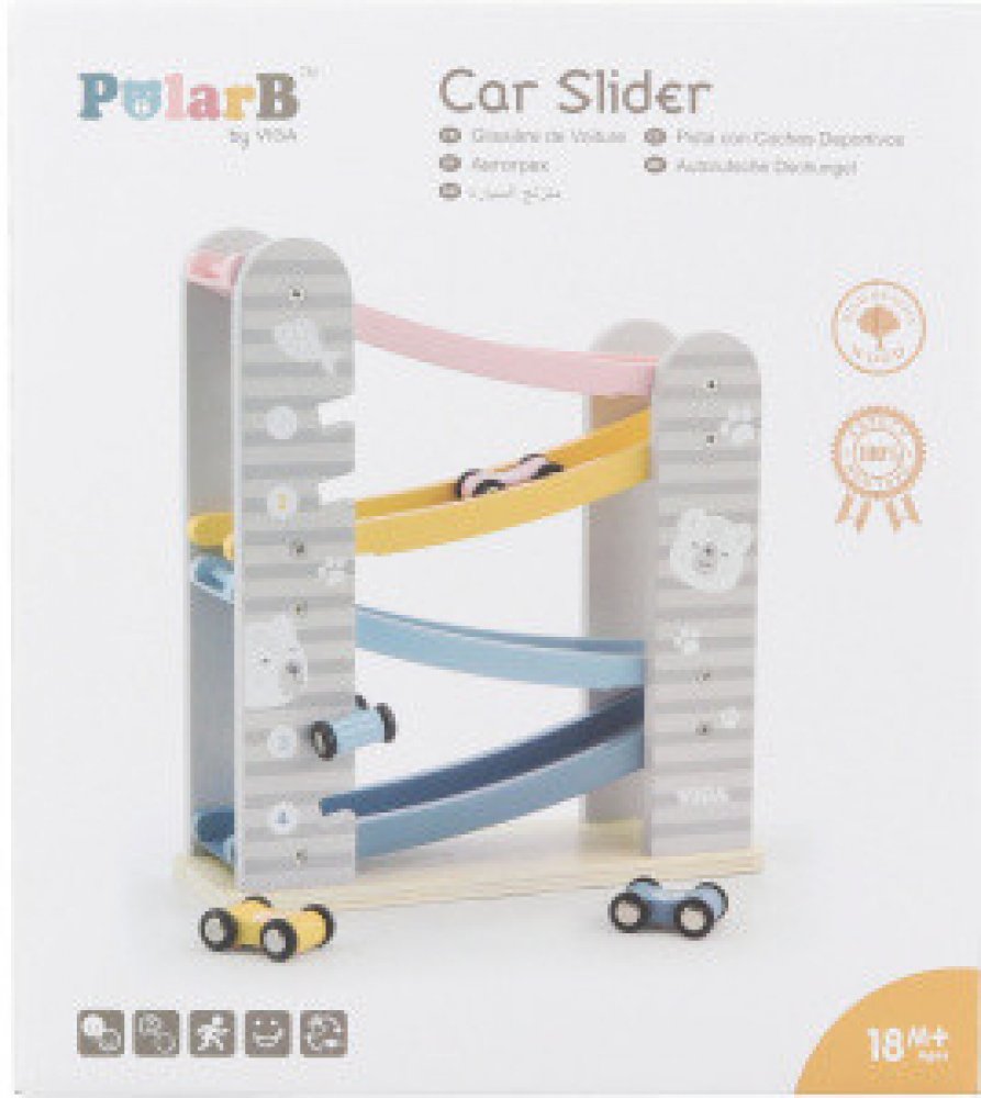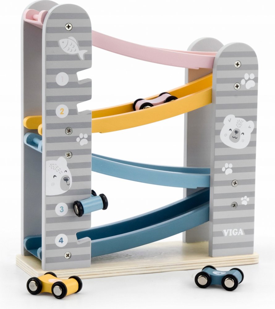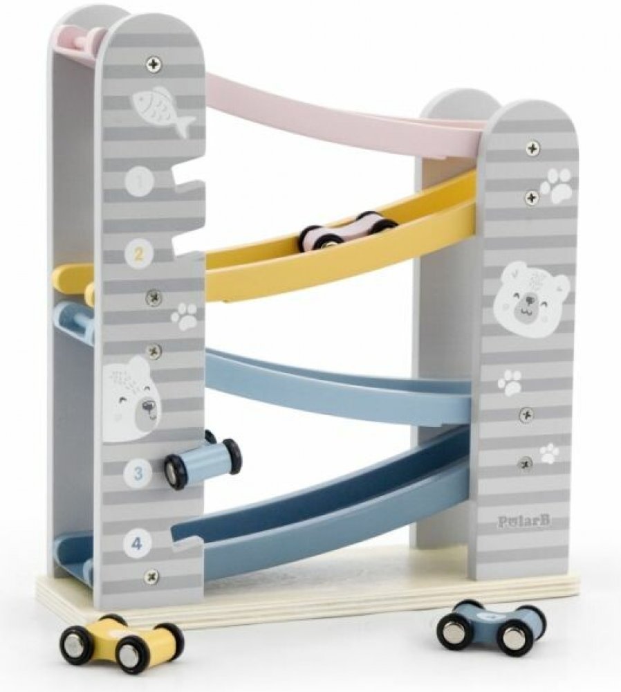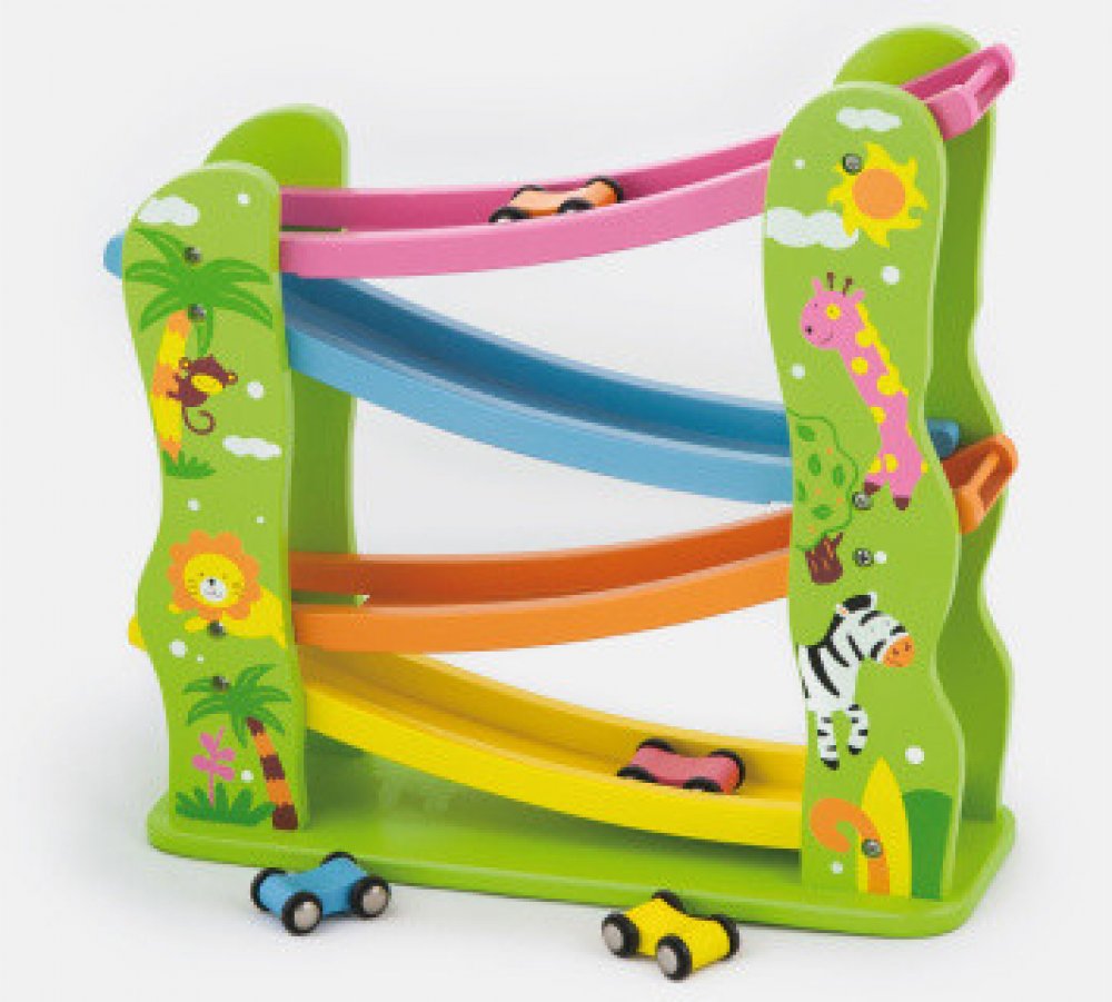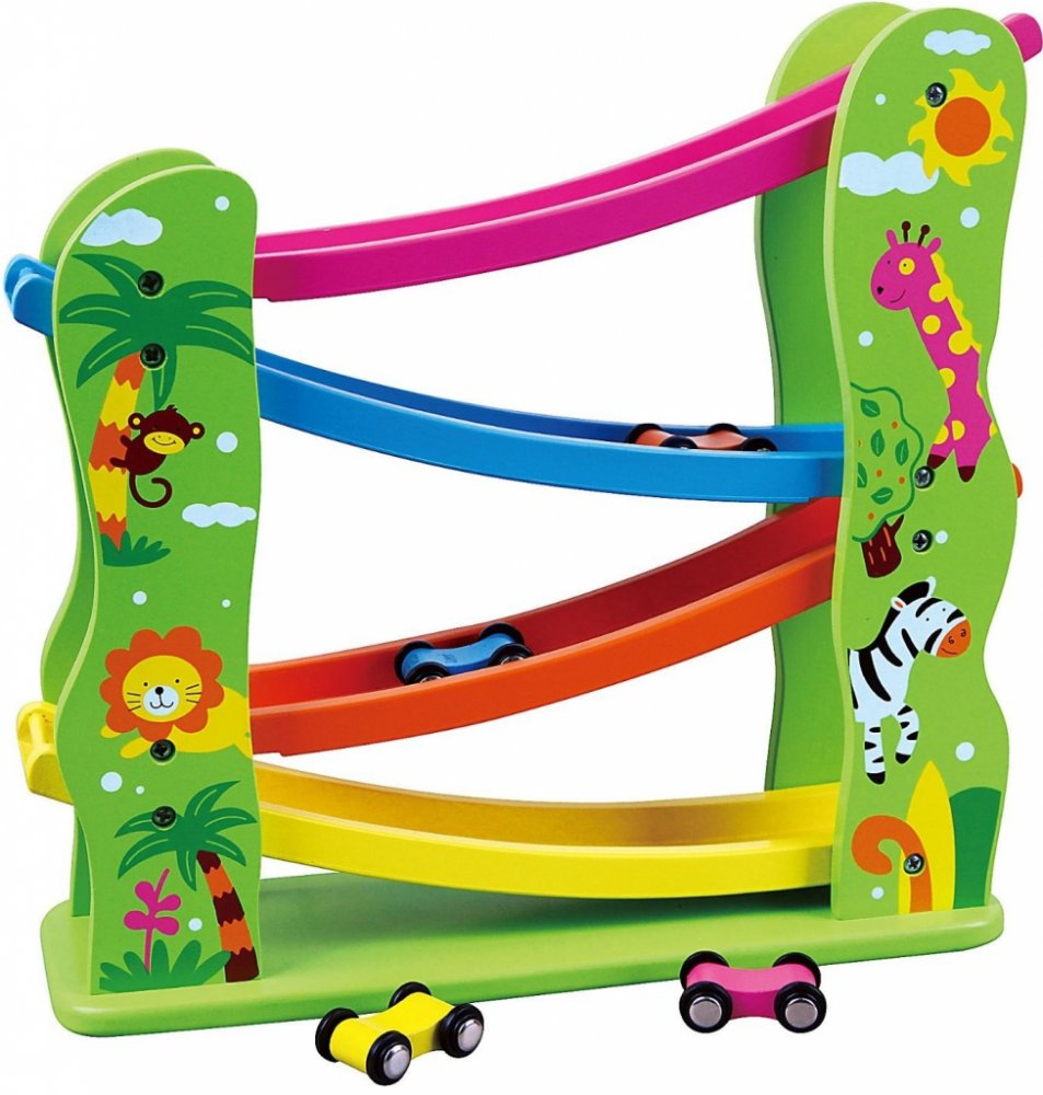 Barevná dřevěná autodráha se čtyřmi barevnými autíčky, které díky překlopení snadno zdolávají kaskádu barevných silniček. Postavte autíčko na nejvyšší část autodráhy a pozorujte co udělá!