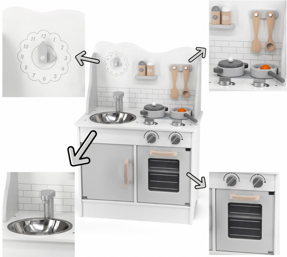 Každá kuchyňka má dřez, troubu a sporák, kde můžete vytvořit oblíbené pokrmy pro celou rodinu. Postav hrnec na sporák, jehož hořáky se rozsvítí, a připrav libovolné jídlo pro panenky a medvídky. Vařič je vybaven potřebným příslušenstvím při vaření.