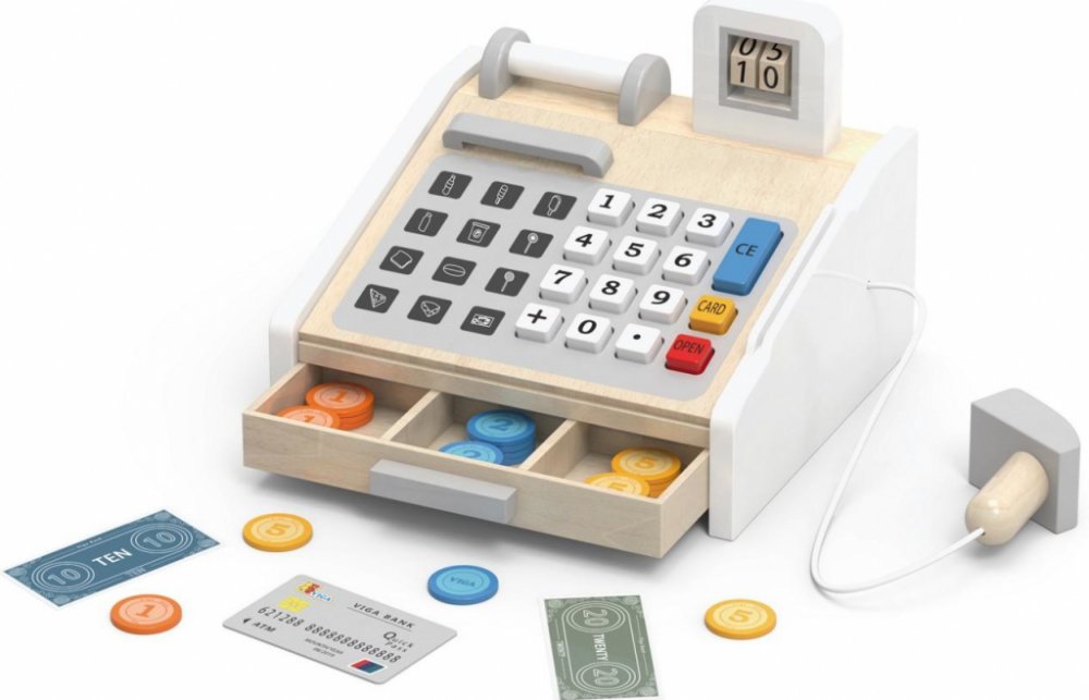 Dřevěná pokladna se skenerem a papírovými štítky. Balení obsahuje i 40 dřevěných mincí a kreditní kartu.