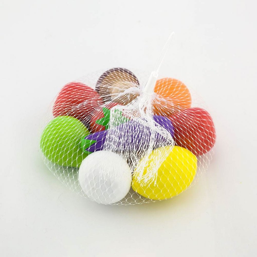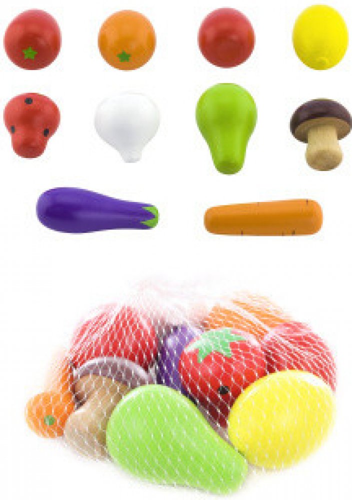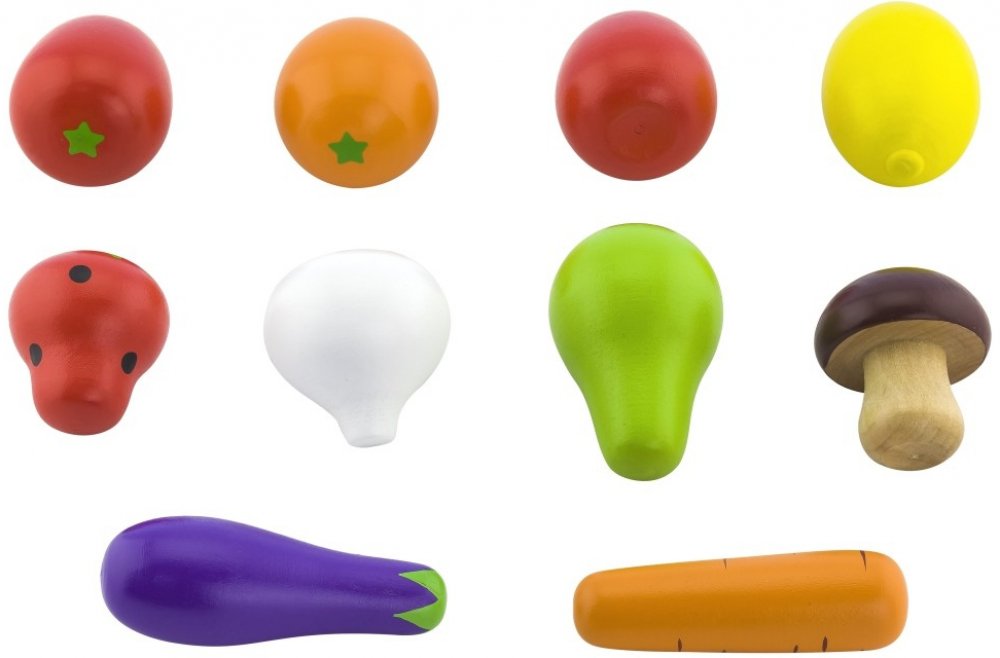 Balení obsahuje dřevěnou mrkev, rajče, česnek, lilek, hříbek, pomeranč, jahodu, jablko, citrón a hrušku.