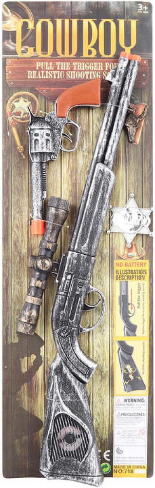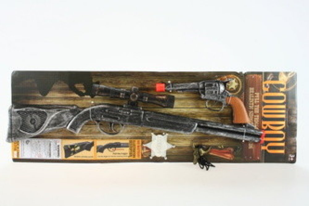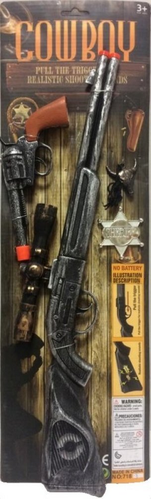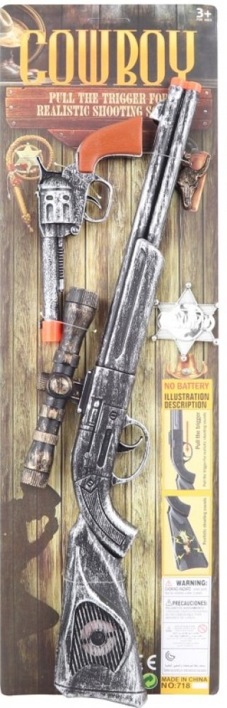 Tato plastová sada pro všechny malé kovboje a pistolníky, obsahuje plastovou pušku se zaměřovadlem, pistol, odznak šerifa a přívěsek. Obě zbraně po stisknutí vydávají zvuk výstřelu, není potřeba baterie.