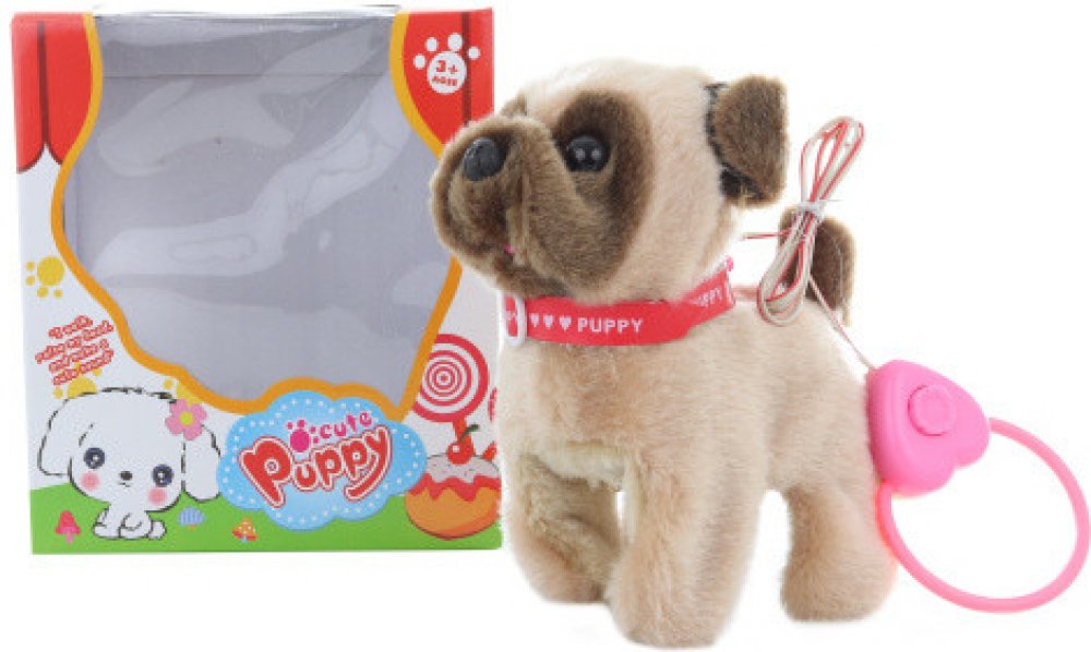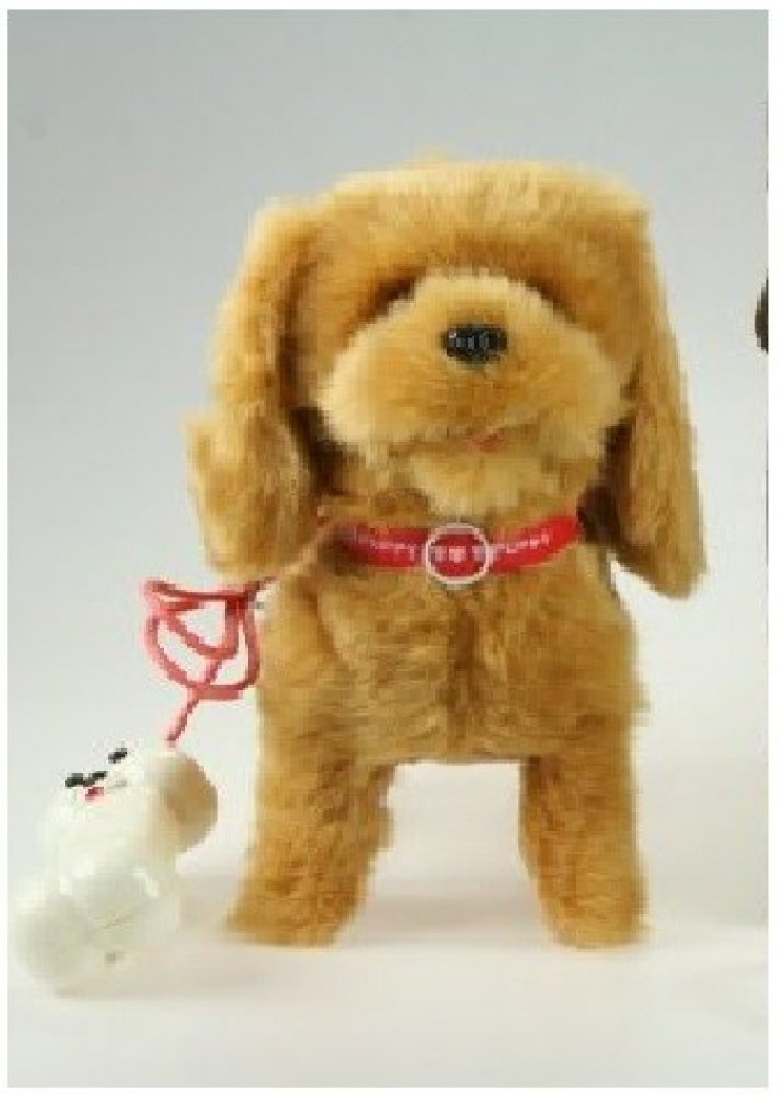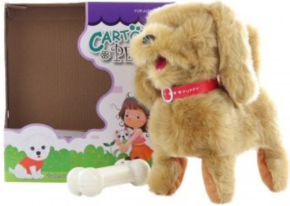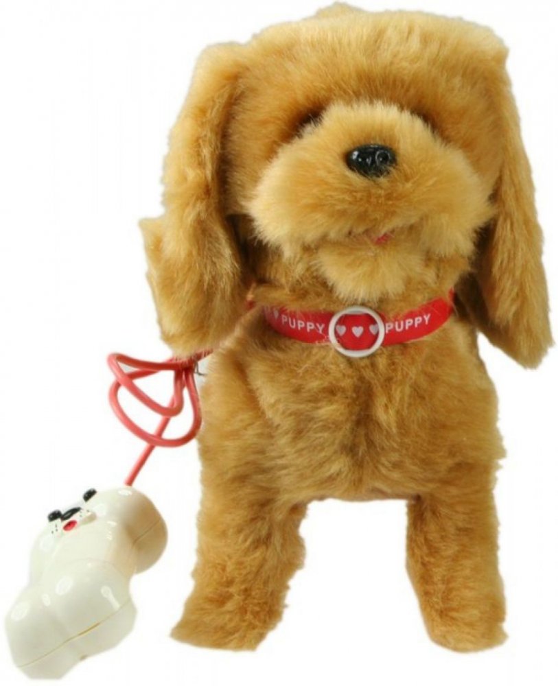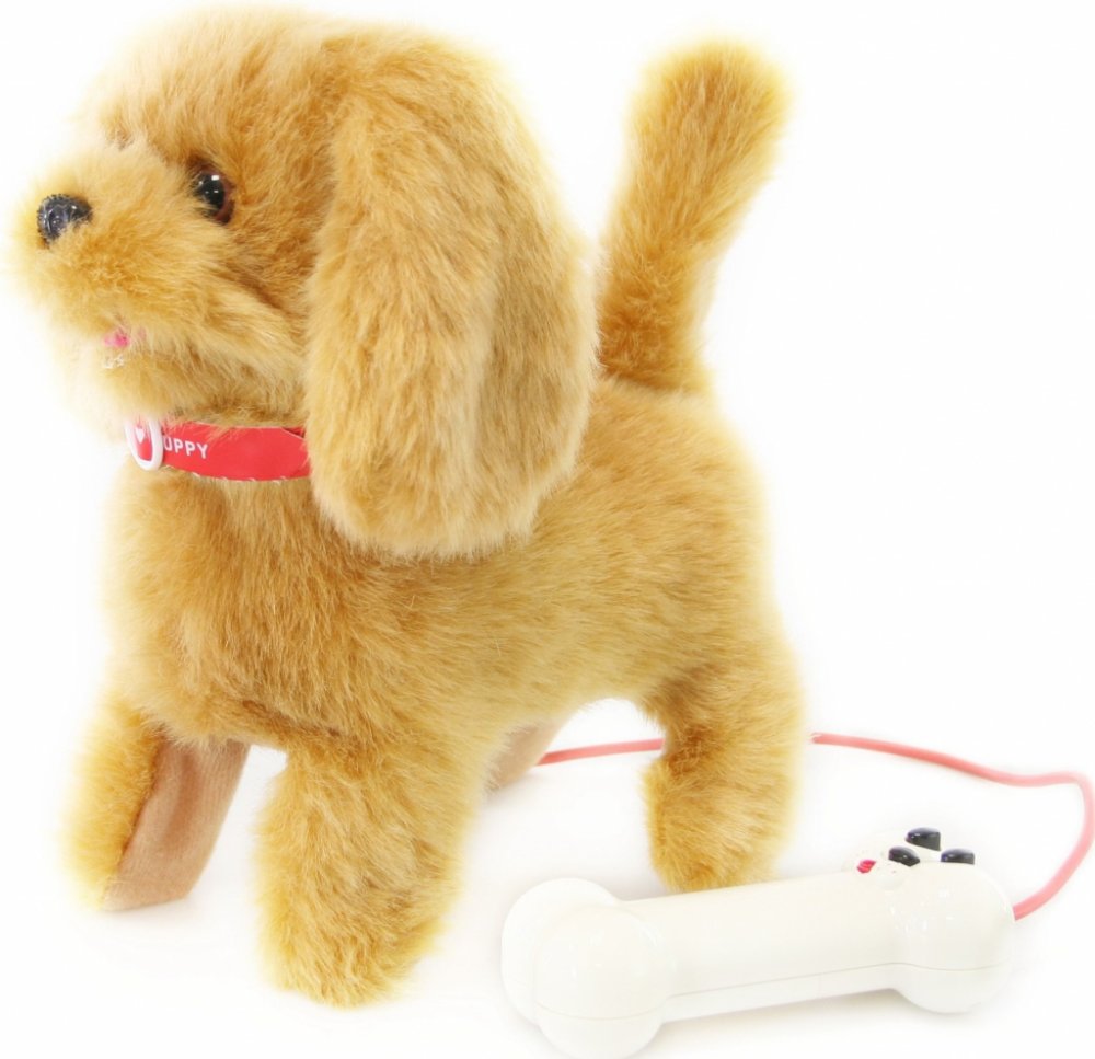 Roztomilý plyšový psík s obojkem z plyše, s kabelem na ovládání, který umí chodit i štěkat. Zvuková hračka - se zvukem.
