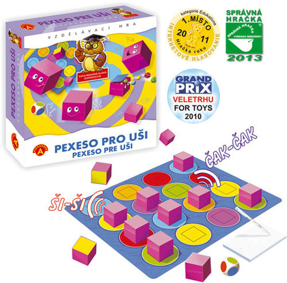 Originální Pexeso pro 2-3 hráče od 4 let, při kterém zapojíte sluch. Cvičí sluchovou paměť a navíc trénuje barvy a počty. Opravdu poznáte 2 stejné zvuky? Obsahuje i těžší variantu hry od 8 let se speciální barevnou hrací deskou. Hra získala 3 ocenění odborníků i veřejnosti.