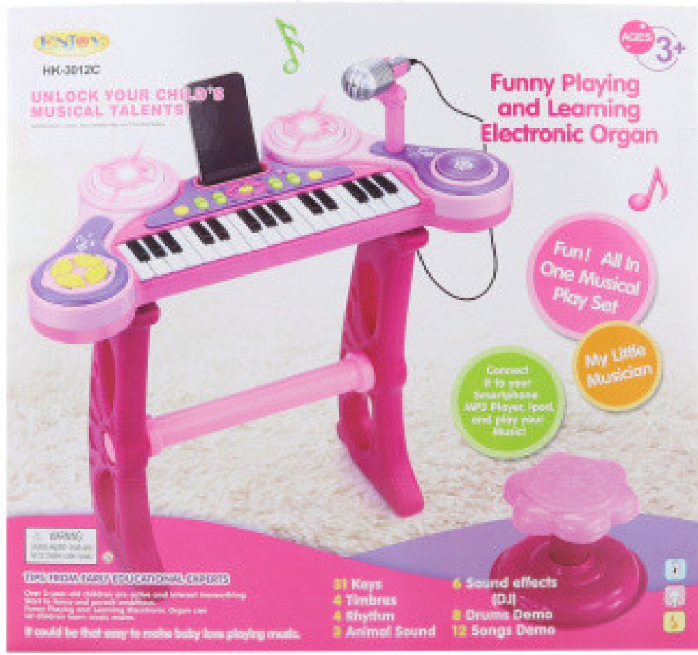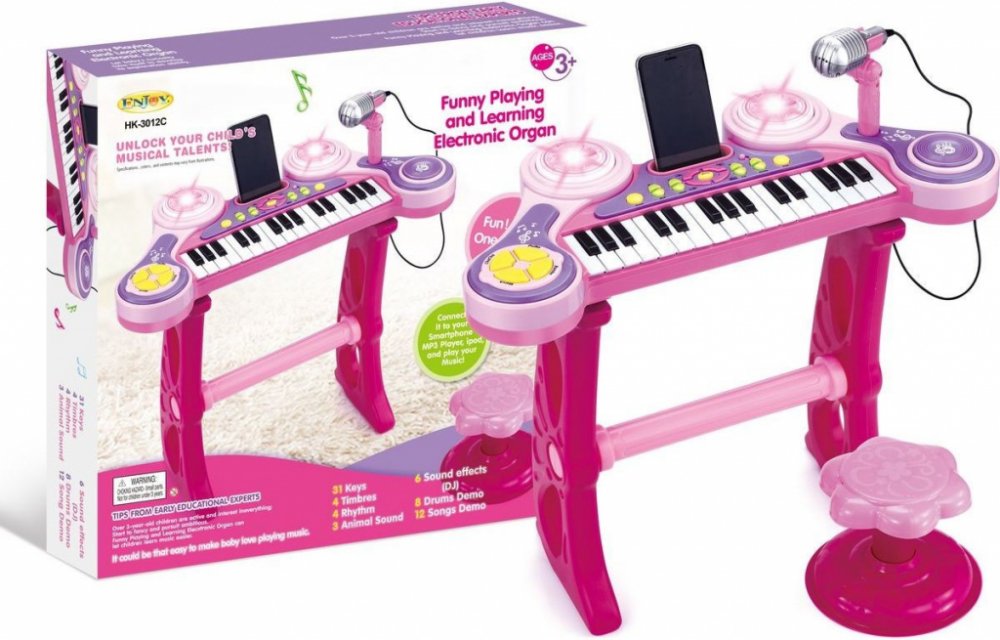 Piánko na baterie růžové Plastové piano se stoličkou. Na pianu lze kromě klasických tónů také navolit různé podkresové melodie a měnit hudební nástroje. Součástí je také mikrofon a konektor pro připojení MP3 přehrávače. Piáno je na baterie (3 x AA - nejsou součástí). Součástí je také dětská stolička. Rozměry piana cca 49 x 24 x 57 cm Rozměry balení cca 55,5 x 54 x 8 cm Věk 3+