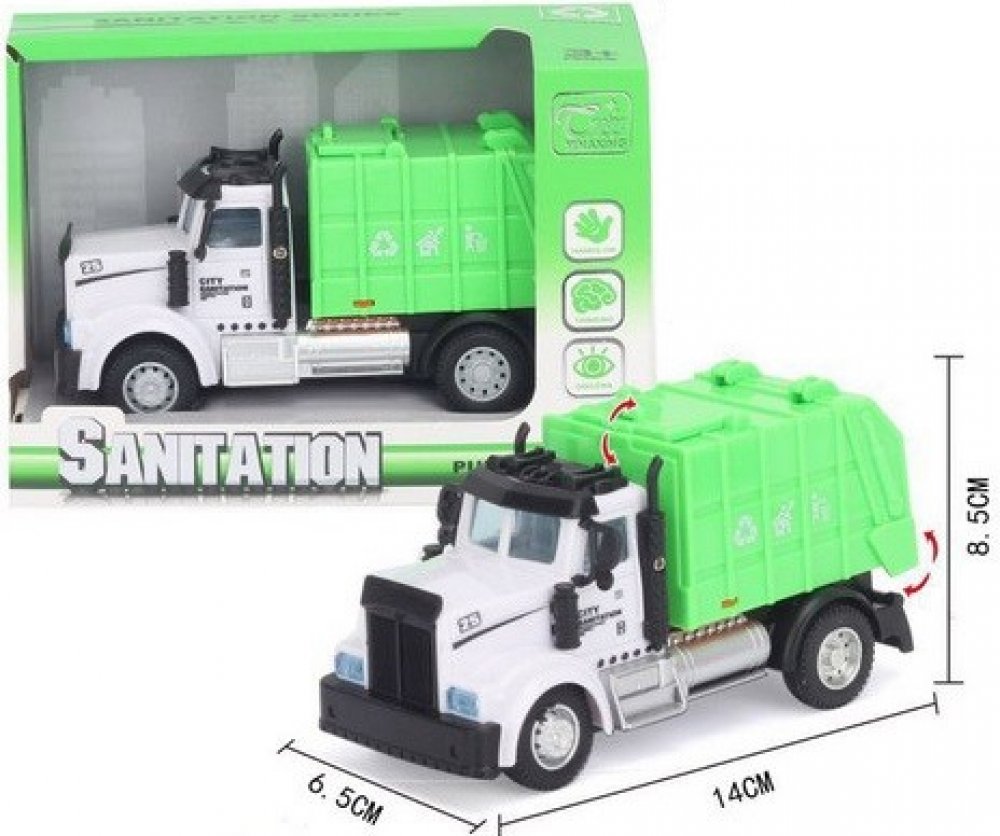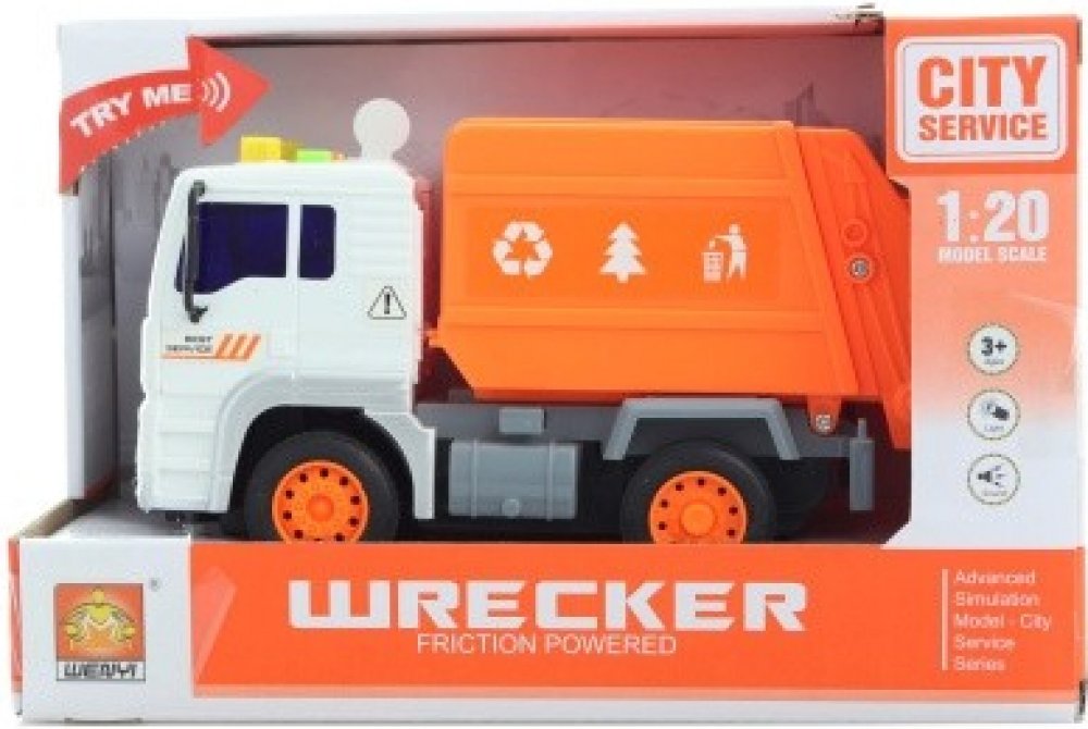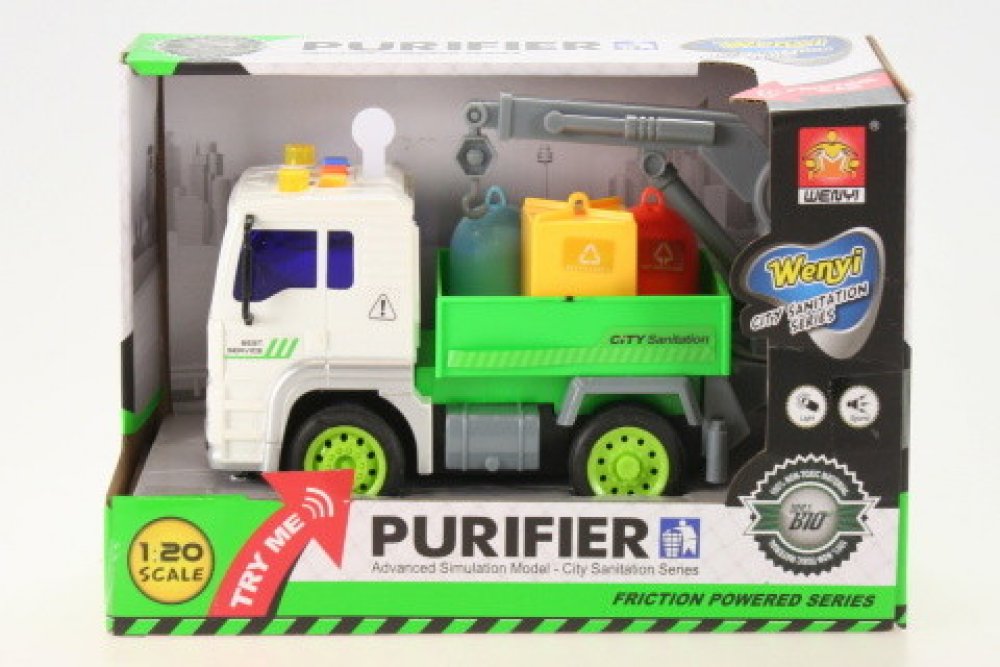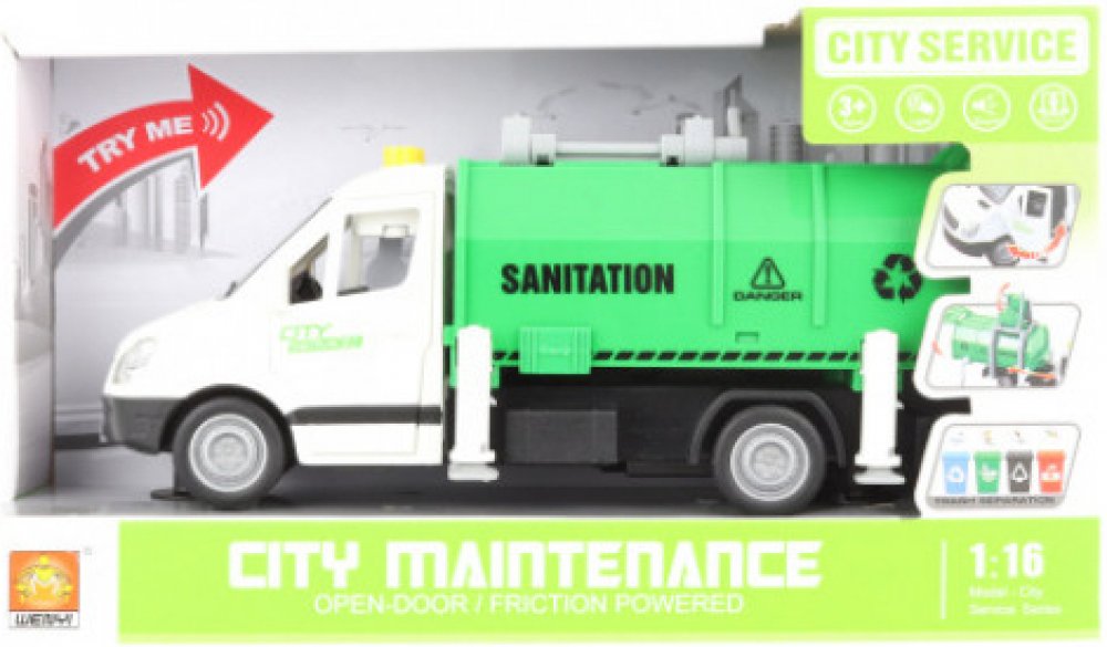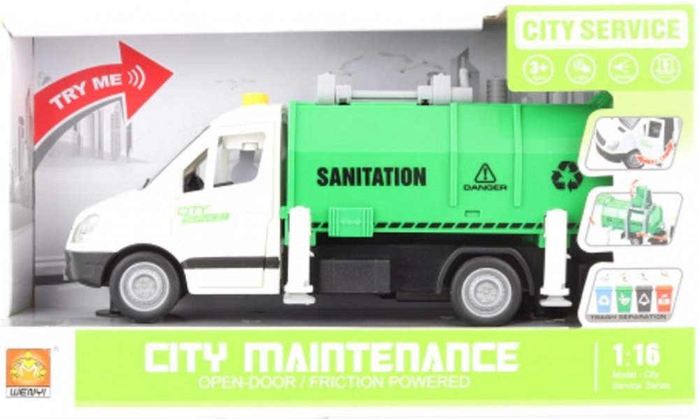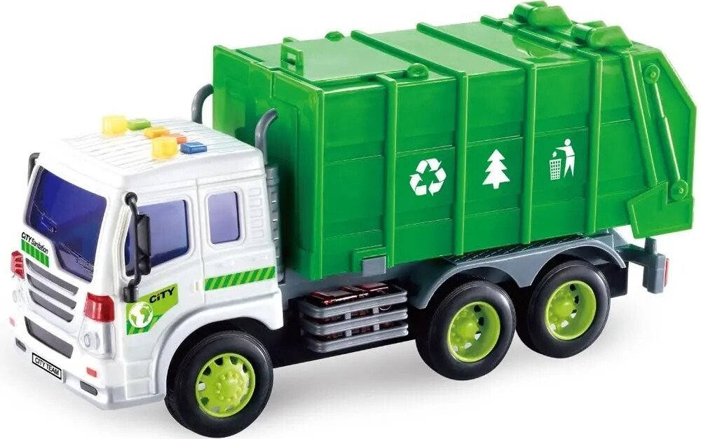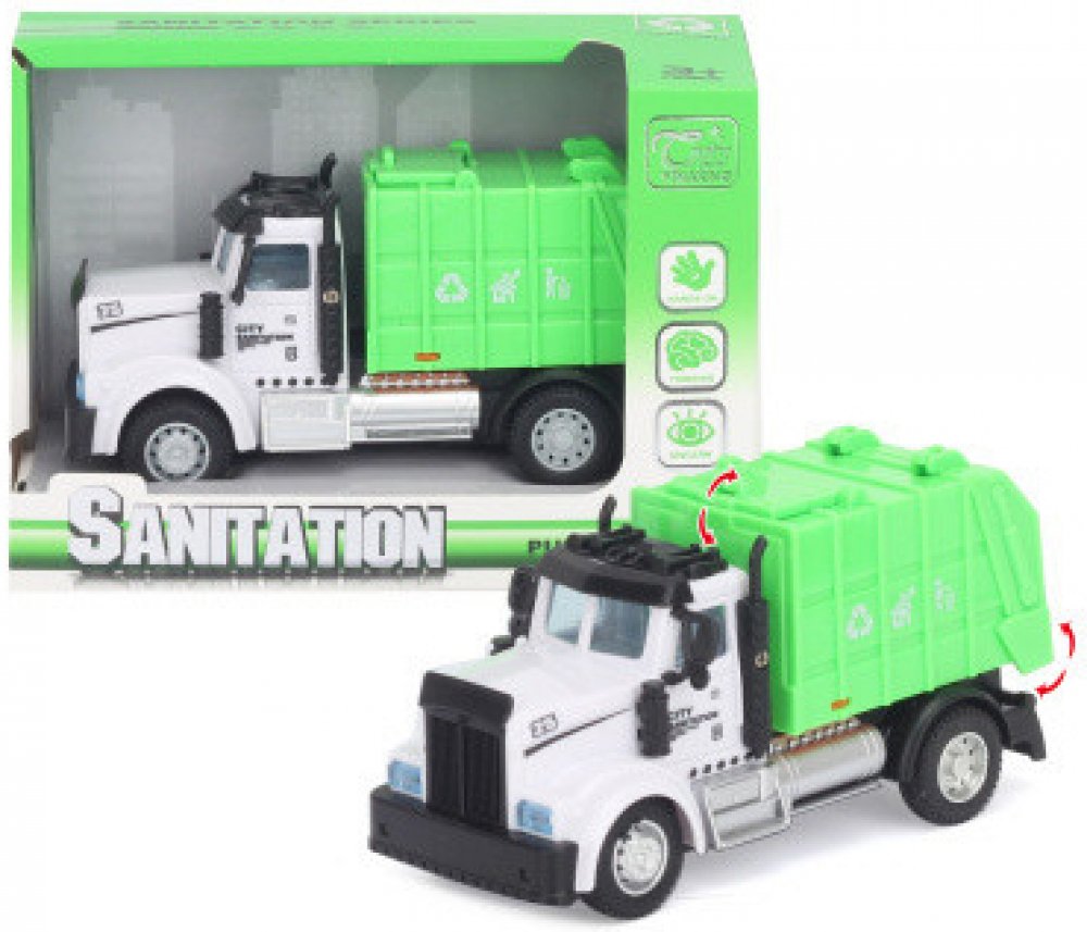 Auto popelářské na baterie. Auto vydává zvuky a svítí. Napájení na 3 AG13 baterie (jsou součástí).