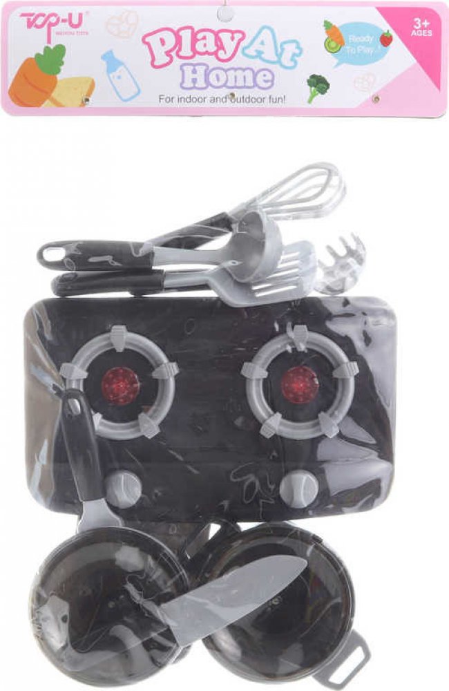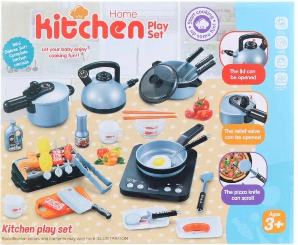 Sada nádobí s vařičem. Balení obsahuje vařič o velikosti cca 23 x 13 cm hrnec pánev 2 pokličky nůž a další doplňky. Vařič svítí a vydává zvuky. Napájení na 2 AA baterie nejsou součástí. Rozměry balení cca 27 x 42 x 6 cm. Věk 3