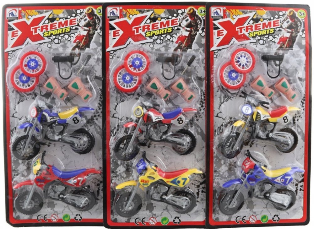 \nSada 2 šroubovacích motorek. Materiál plast+kov. Baleno na blistru. Balení obsahuje 2 motorky, náhradní kola a šroubováček. Rozměry balení cca 15x31x2 cm. Velikost motorky cca 12x8 cm. Mix barev, do