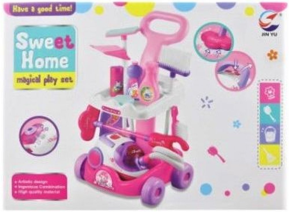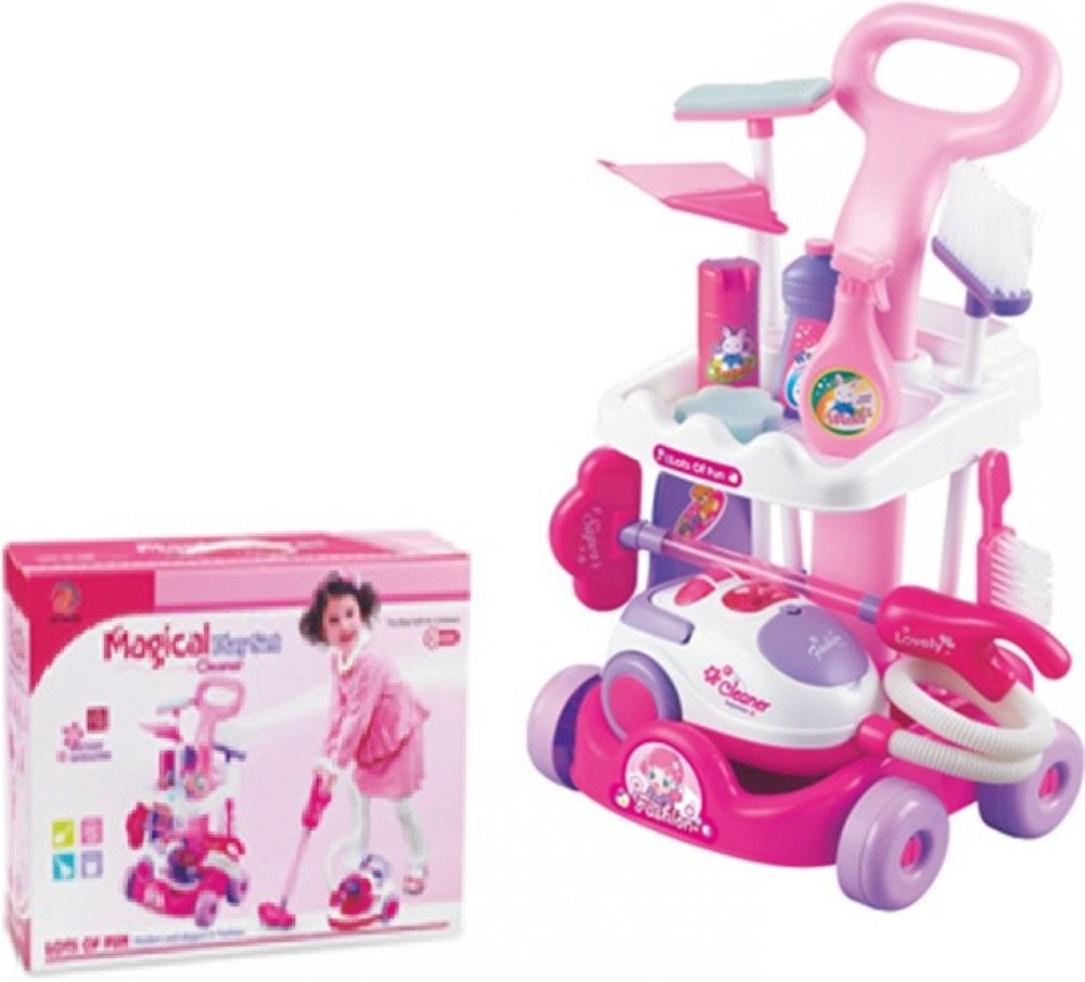 Lamps Úklidový vozík růžový. Plastový růžový uklízecí vozík s doplňky. Balení obsahuje vozík, vysavač, smeták, mop, smetáček, lopatku a další doplňky. Napájení vysavače na 3 AA baterie (nejsou součástí). Rozměry balení cca 49 x 36 x 15 cm. Věk 3+