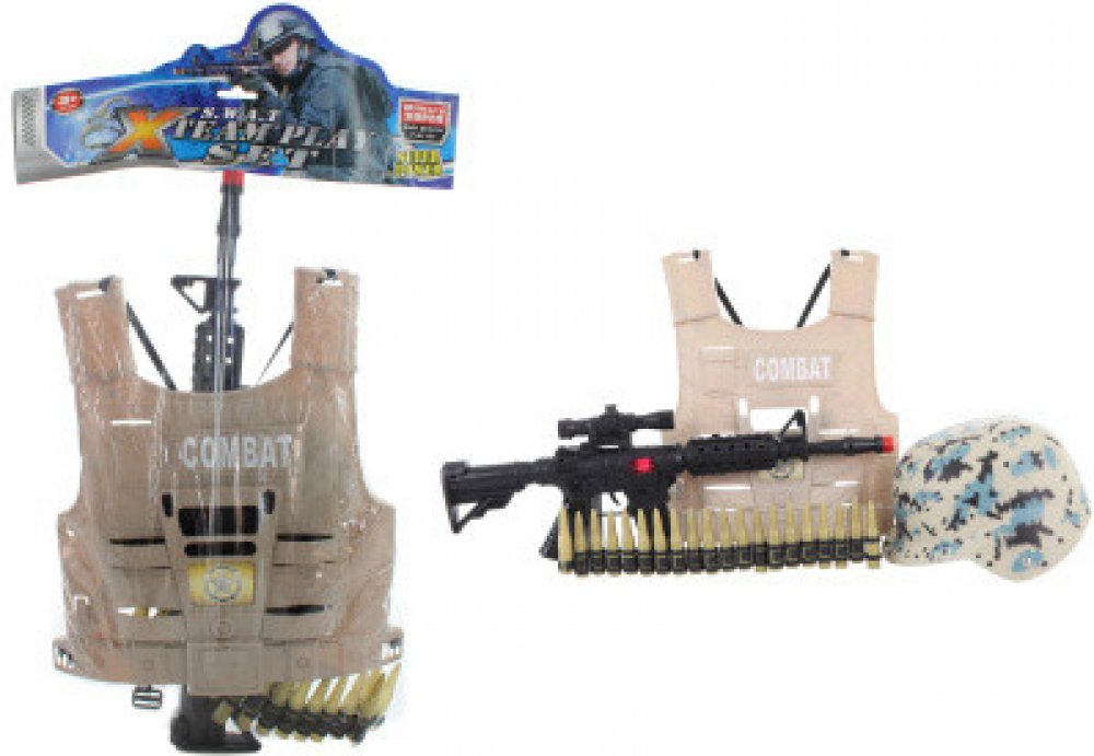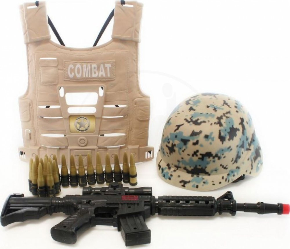 Vojenská sada obsahuje helmu pro malého vojáka o velikosti cca 21 x 12 cm, plastovou vestu na gumičky o velikosti cca 29 x 32 cm, plastový samopal a náboje.