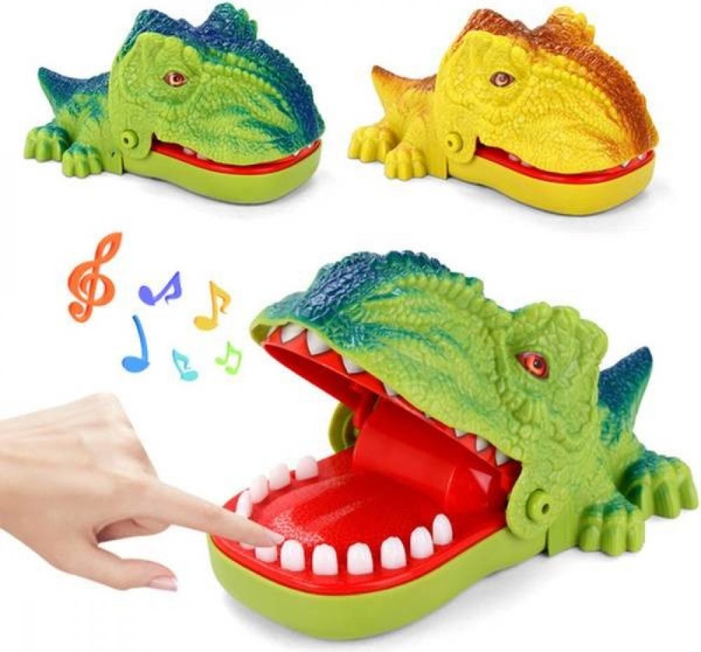 Zábavná potřehová hra. Dinosaurus otevře tlamu a děti se střídají a postupně zatlačují jeho zuby.