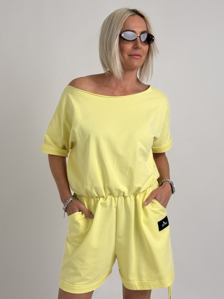 Dokonalý bavlněný overal s gumou v pase, lodičkovým výstřihem, krátkým rukávem a možností stažení na nohavicích.