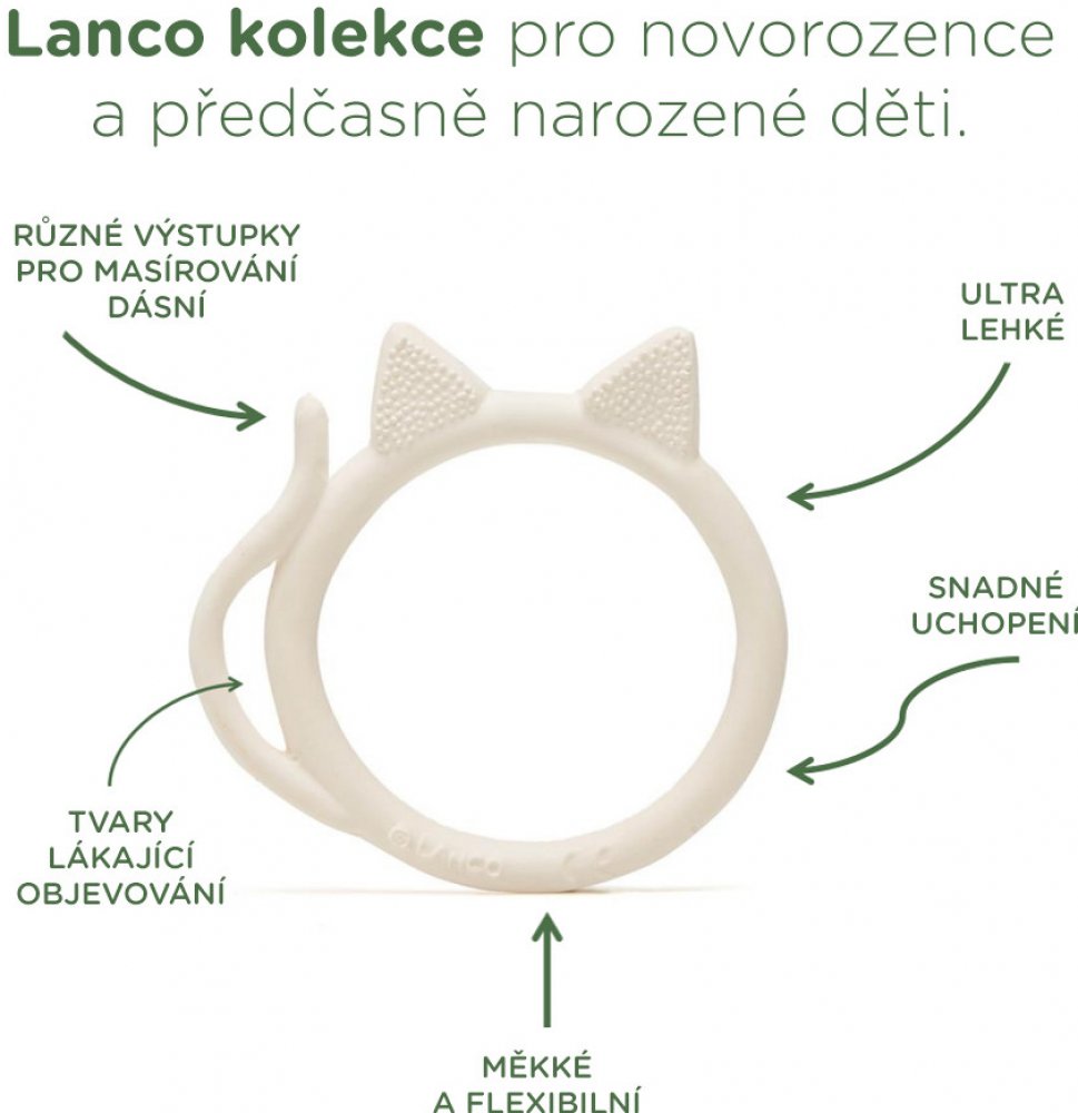 Hračky Lanco jsou vyrobené ze 100% přírodního kaučuku. Tento přírodní materiál pochází z plantáží stromů Hevea brasiliensis (Kaučukovník brazilský) pěstovaných v Malajsii. Kousátka jsou ideální pro děti, kterým se právě prořezávají první zoubky. Jedinečná vůně a chuť přírodní gumy je u dětí velmi oblíbená. Měkčí i tvrdší části a výstupky kousátek jemně masírují dětské dásně a přinášejí úlevu od bo...
