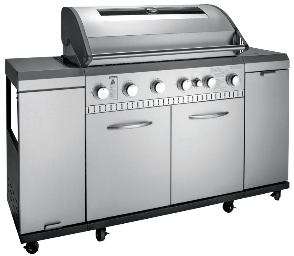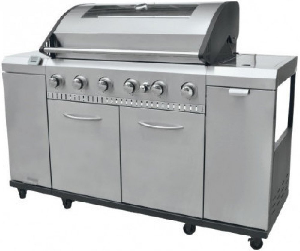 Plynový gril je vybaven dvoudílným litinovým roštem, litinovou deskou, odklápěcím krytem grilovací plochy s kontrolním okénkem a teploměrem, bočním výsuvným stolkem a skříňkou pro připojení a bezpečné uložení plynové láhve. K dispozici je šest nerezových hořáků a boční sporák se zapalováním Piezo a plynovou regulací.