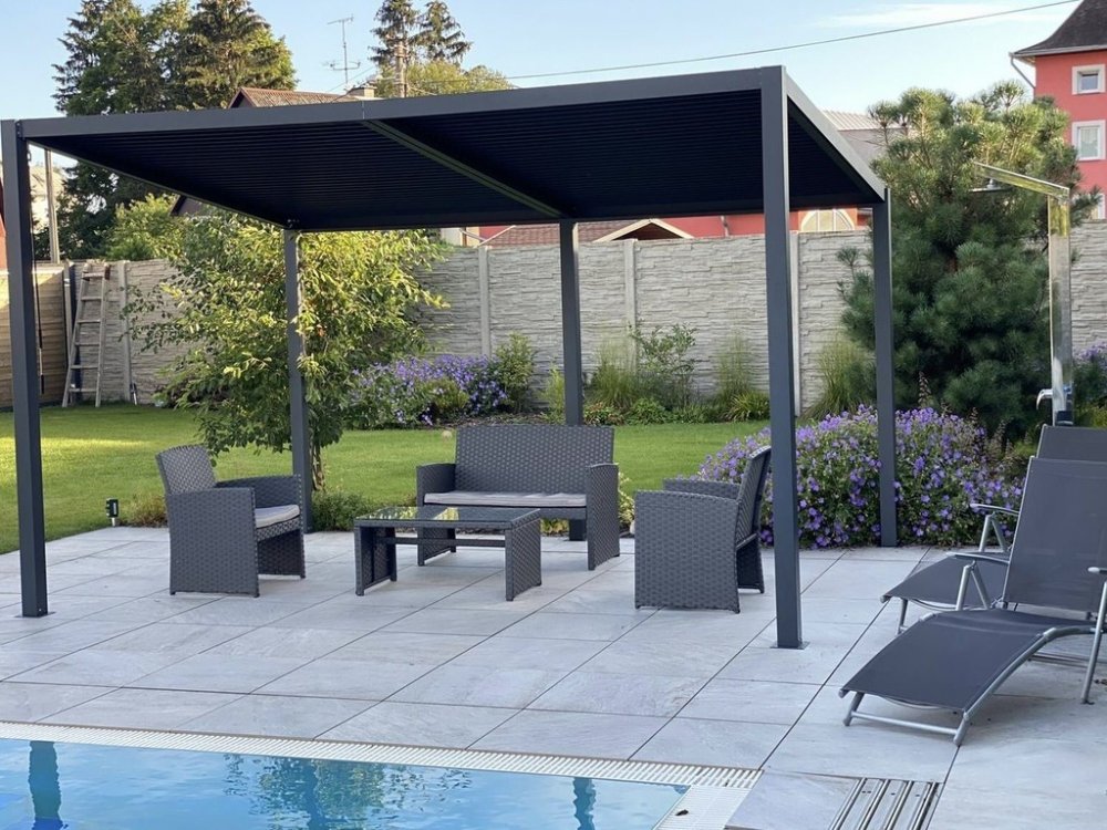 Zahradní hliníková pergola, ve které naleznete příjemné místo k odpočinku v čím dál tím častějších horkých letních dnech. Střecha je složená z desítek otočných lamel a ochrání Vás před nepříznivým počasím. Lamely je možné manuálně otáčet v úhlu 0 až 90o. Malá ručně ovládaná klika ovládá mechanismus střechy a otáčením kliky zajistíte synchronizované natáčení lamel. Úhel natočení 90o zajistí otevřen...