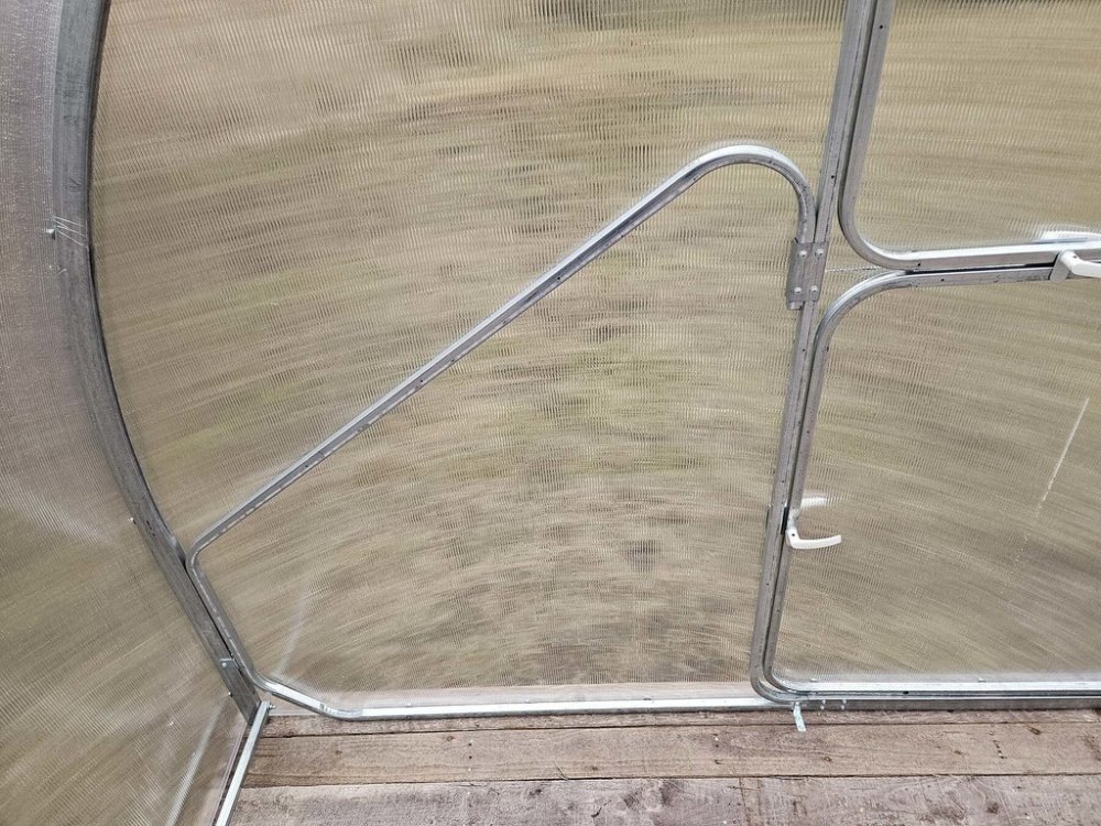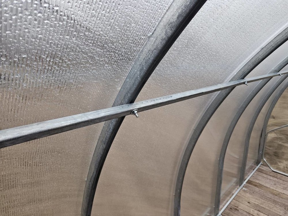 Konstrukce - konstrukce skleníku je z masivních obloukových trubek 40 x 20 mm (podélníky a vzpěry 20 x 20 mm). Materiál profilů je galvanicky pozinkovaný = na povrchu je vytvořená silná vrstva ochranného nekorodujícího zinku. Jednotlivá žebra nosných oblouků jsou od sebe vzdálena pouhých 67 cm, což je velká výhoda tohoto modelu skleníku oproti jiným výrobkům na českém trhu. Malá rozteč oblouků, profil 40 x 20 mm a fakt, že jsou vyrobeny z jednoho kusu oceli garantuje extrémní únosnost celé konstrukce skleníku. Přední a zadní čela skleníku jsou z výroby sešroubované a tvoří jednolitý celek. Přední i zadní čelo mají jednokřídlé dělené dveře na pantech (horní a spodní díl, kdy horní díl funguje jako samostatné okénko). Skleník je tedy PRŮCHOZÍ. Jako příplatkové příslušenství lze dokoupit automatický otvírač.