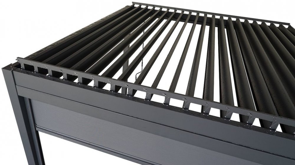 Pergolu lze vybavit stahovatelnými síťovými bočními roletami (příplatkové příslušenství), které poskytnou dodatečné zastínění a soukromí. Rolety lze snadno povytáhnout a zafixovat podle aktuálních potřeb. To vám umožňuje vytvořit si útulné prostředí i při větším slunečním žáru nebo v chladnějším počasí.