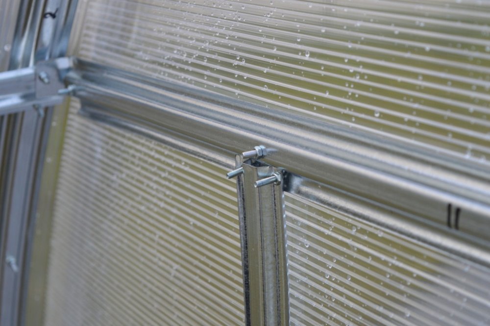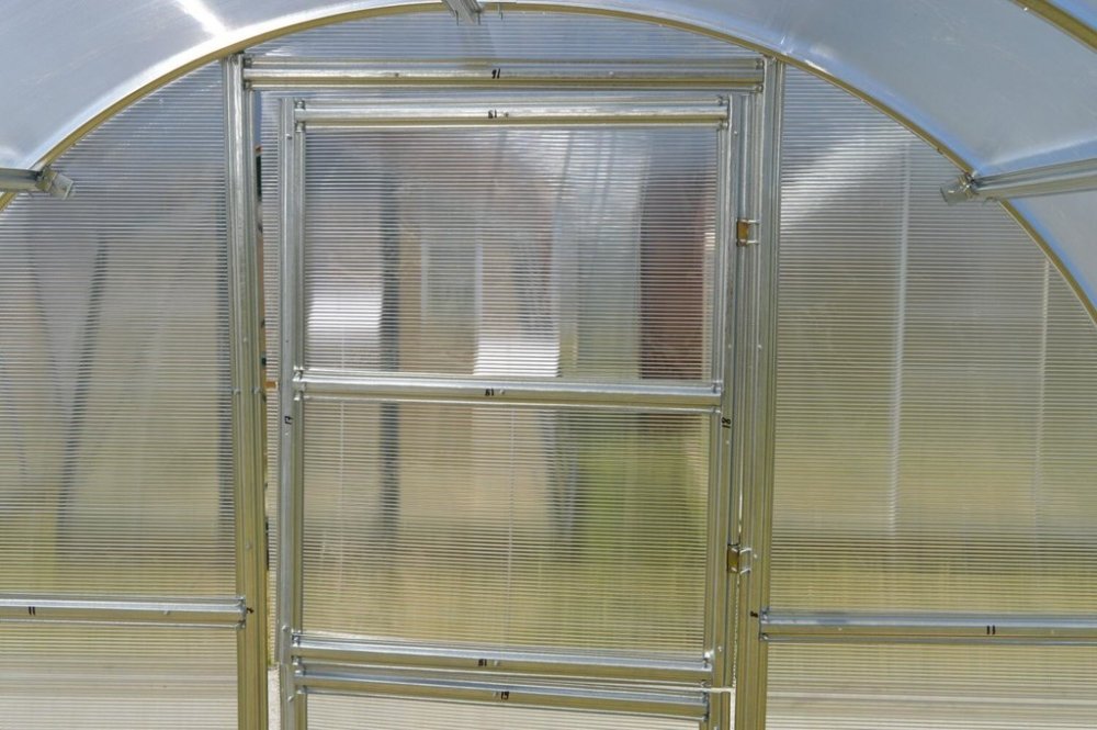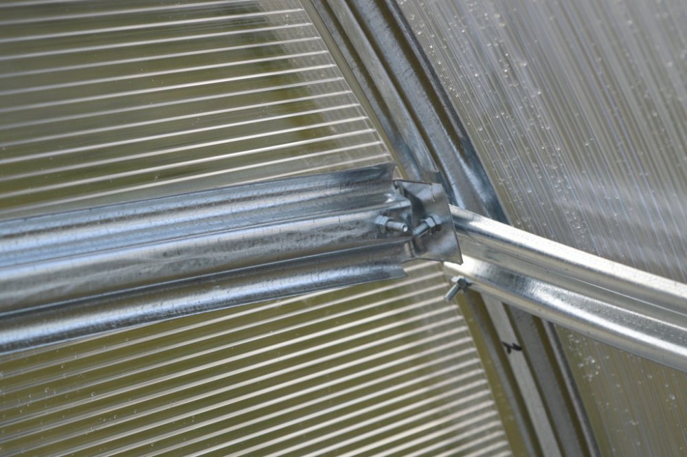 Konstrukce - konstrukce skleníku je sešroubovaná z pozinkovaných omega profilů síly 0,70 - 0,85 mm. Materiál profilů je galvanicky pozinkovaný. Jednotlivá žebra nosných oblouků jsou od sebe vzdálena pouhých 60 - 80 cm, což je velká výhoda tohoto modelu skleníku oproti jiným výrobkům na českém trhu. Malá rozteč oblouků 0,6 - 0,7 m garantuje vysokou únosnost celé konstrukce skleníku. Přední a zadní čela skleníku mají vestavěné dvojité dveře, takže skleníkem je možné procházet z obou stran. Pokud otevřete horní část dveří na obou koncích skleníku, zajistíte tím pohodlné větrání celého skleníku, aniž by do něj měly přístup děti nebo domácí zvířata. V případě, že nechcete montovat druhé dveře v zadní části skleníku, je možné do stěny umístit větrací okénko, do kterého lze namontovat automatický otvírač LANITPLAST (k zakoupení jako doplňkové příslušenství).