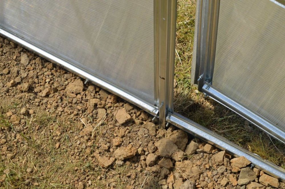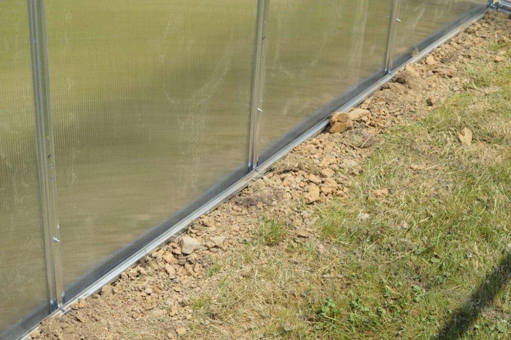 Kotvení skleníku:Skleník nepotřebuje žádnou podezdívku, protože konstrukce skleníku je připravena na zapuštění do země do hloubky cca 20 - 25 cm. Do děr v zemi se zasunou kotevní profily ve tvaru obráceného velkého písmene T, které se zabetonují. Skleník lze ukotvit i na dřevěnou / zděnou / betonovou podezdívku, vyžaduje to však drobné kutilské zásahy a především domácí vyrobení atypických plechových L úchytek pro přišroubování profilů k podezdívce (výrobce ukotvení skleníku na podezdívku nepředpokládá).