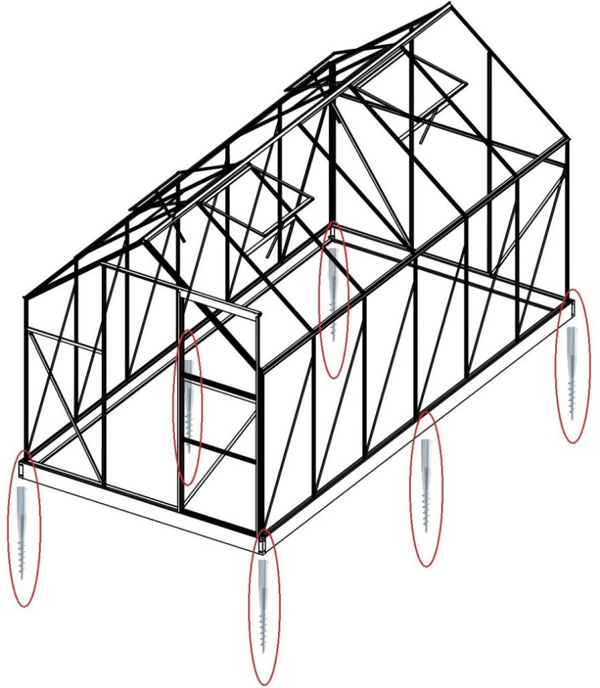 Kotvící sada není použitelná na obloukové skleníky a na skleníky bez základny. Není nutné stavět podezdívku, vruty upevní skleník přímo k zemi. Na šířku i na délku je maximální rozteč mezi sousedními vruty 200 cm.