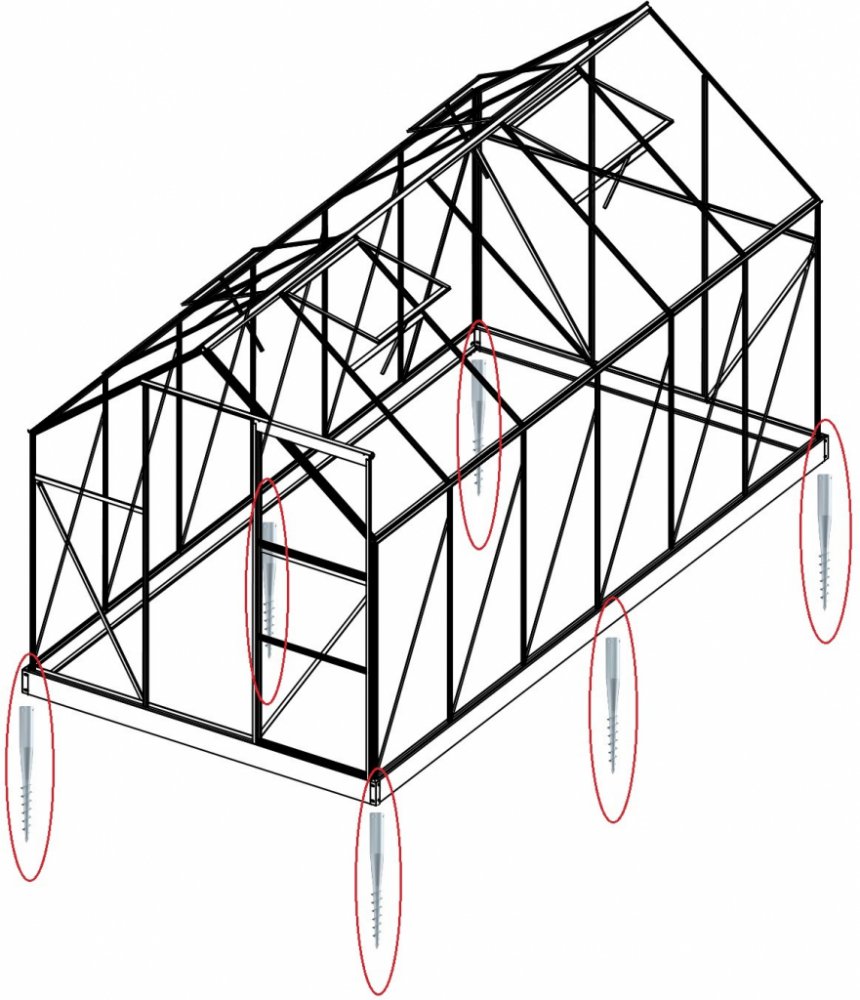 - Zemní vruty slouží pouze pro ukotvení základny, resp. skleníku. Základna musí být po celém obvodu podepřená, tak aby mezi základnou a zemí nebyla mezera. Tu lze vyplnit hlínou a dobře udusat nebo cihlami (dlaždicemi, dřevěnou fošnou, apod.). Vruty je možné zavrtat i mírně pod úroveň okolního terénu (max. cca 1-2 cm). Pak je nutné prostor mezi vruty do této hloubky pro základnu odkopat. Pozor – pro přišroubování víčka vrutu je také nutné trochu odkopat zeminu okolo víčka. Toto řešení má určitou výhodu v tom, že základna zasahuje až na zem a nevznikne volný prostor, který je nutný vyplnit. Pokud necháme mezi zemí a základnou volný prostor, tak do skleníku mohou velmi lehce vlézt drobní hlodavci a škůdci plus může dojít k poškození skleníku podfouknutím větru do skleníku spodem pod základnou.