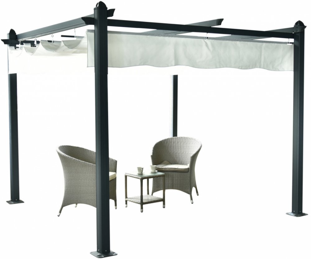 Zahradní hliníková pergola, ve které naleznete příjemné místo odpočinku v čím dál tím častějších horkých letních dnech. Zatahovací střecha Vás ochrání před nepříznivým počasím. Jednoduchý lankový mechanismus plachtou lehce pohybuje a umožňuje střechu částečně nebo i úplně zatáhnout. Konstrukce pergoly je z odolné hliníkové slitiny a je nastříkaná prášk...