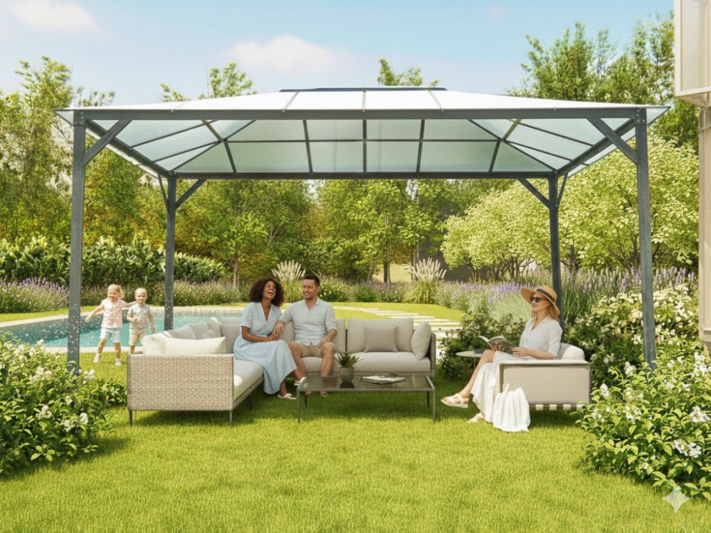 Zahradní hliníkový altán LANITPLAST 33 poskytuje potřebný stín pro posezení na zahradě. Nejedná se o běžný lehký altán s trubkovou skládací konstrukcí (jako je běžně ke koupi v hobbymarketech), ale o masivní výrobek zhotovený ze silných vzájemně sešroubovaných hliníkových profilů (síla 1,0 mm) určený k pevné montáži k zemi pomocí patek. Hliníkové profily jsou ochráněny práškovou vypalovací barvou ...