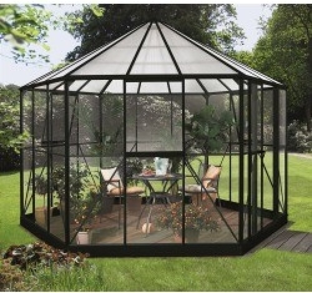 Pavilon HERA 9000 Konstrukce v černé barvě Rozměry: průměr šestiúhelníku mezi vrcholy 380 cm průměr šestiúhelníku mezi stěnami 320 cm výška stěny k okraji střechy 194 cm výška k vrcholku 300 cm Vlastnosti: Skleník je vyrobený z eloxovaných hliníkových profilů. Prosklení je z klasického čirého bezpečnostního skla síly 3 mm a je ukotveno do konstrukce pomocí kovových sponek. Skleník lze postavit pou...