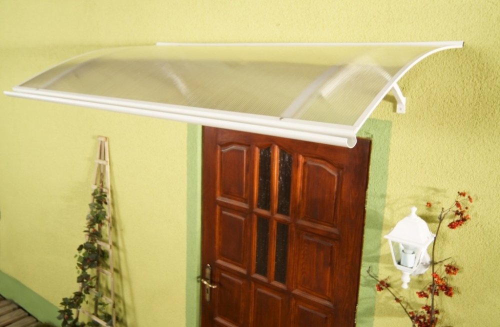 Stříšku nabízíme v rozměrech - šířka "a" 1200 mm x hloubka "b" 870 mm x výška oblouku "c" 250 mm a barevné kombinaci - bílé profily + zasklení čirým komůrkovým polykarbonátem 4,5 mm.