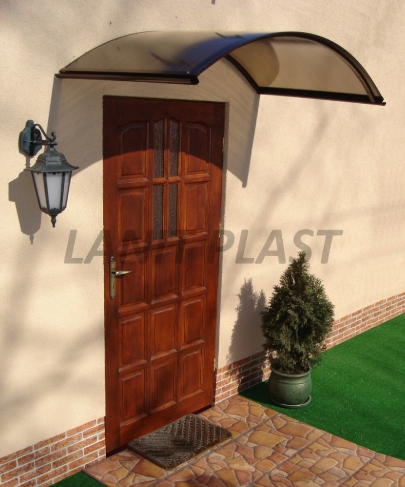 Stříška nad dveře vyrobená z práškově lakovaného hliníku. Na rozdíl od stříšek s plastovou konstrukcí hliníková konstrukce perfektně odolává vlivům počasí, i po letech je pevná a stabilní. V zimě mrazem nekřehne a ani na silném letním slunci nedochází ke změnám barvy. Stříška je zasklená komůrkovým polykarbonátem síly 4,5 mm s oboustranným UV filtrem (značka LEXAN® - vyrobeno v Rakousku). Jde o velmi kvalitní značkový polykarbonát od jednoho z nejlepších světových výrobců.