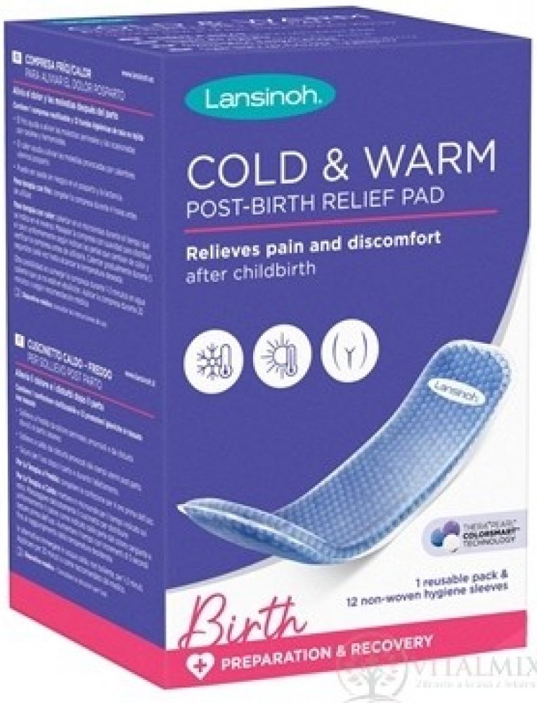 Zdravotnická pomůcka. Zmírňuje bolest a nepohodlí po porodu. Balení obsahuje 1 opakovaně použitelnou vložku a 12 hygienických návleků z netkané textilie. Chladivá úleva od bolesti hráze po vaginálním porodu, rány po císařském řezu a hemeroidech. Hřejivá úleva od nepohodlí způsobeného poporodními děložními křečemi.< li> Bezpečné použití po porodu a během kojení.< li>