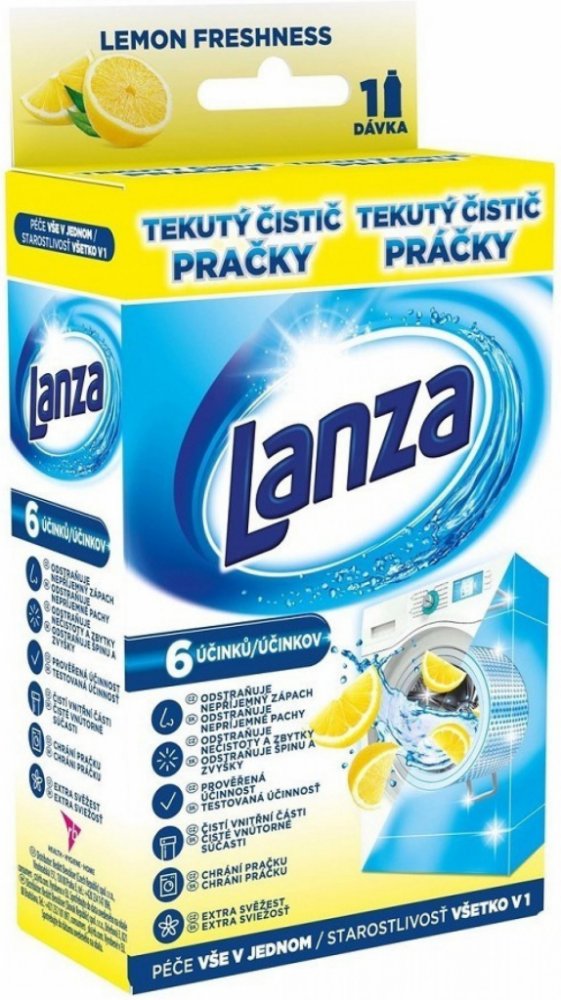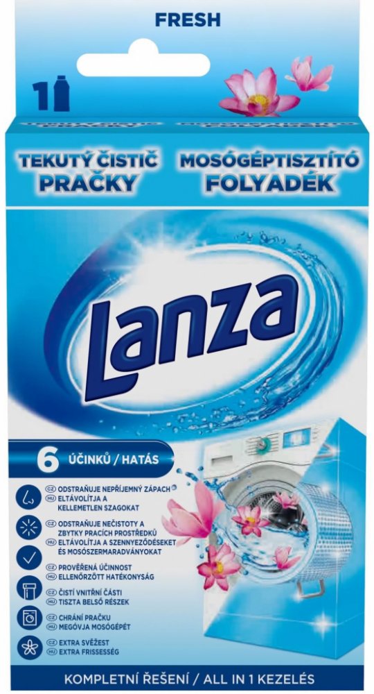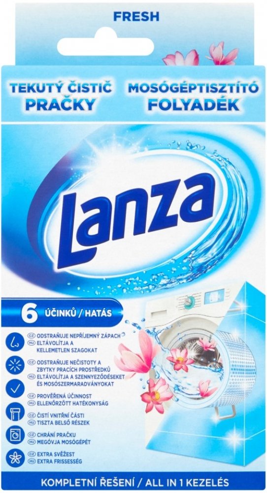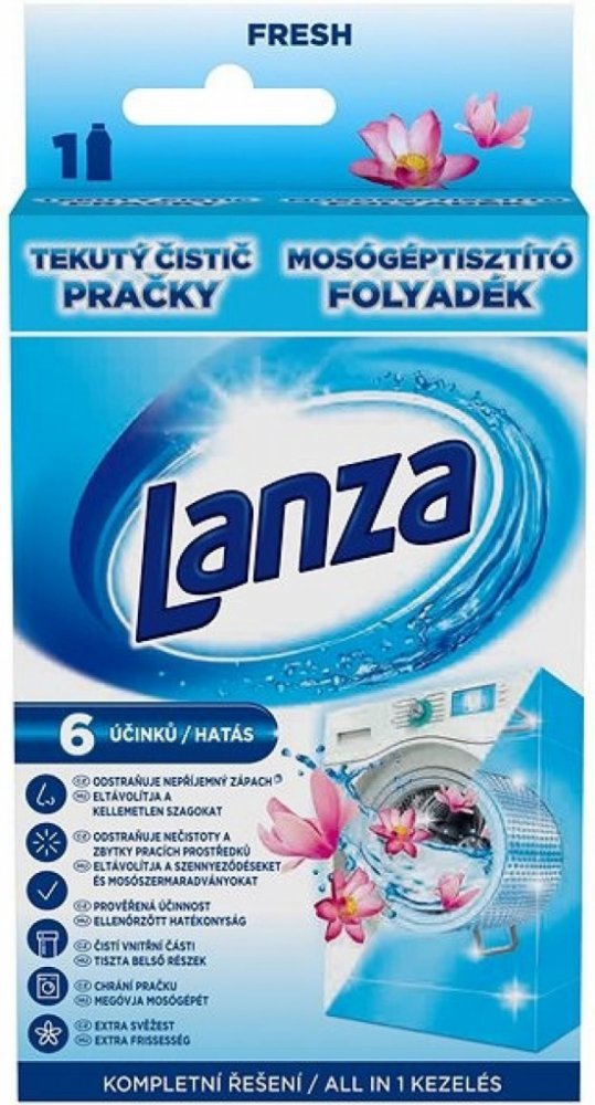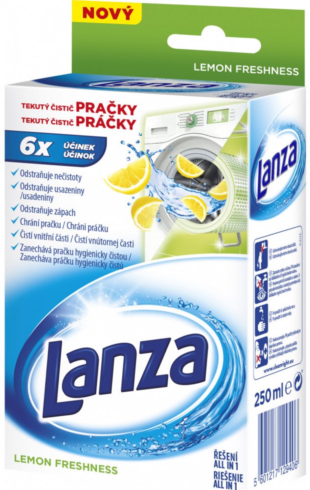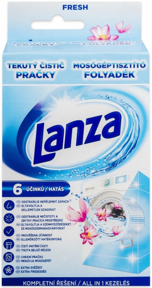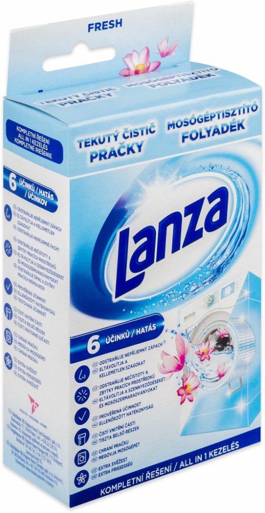 Tekutý čistič pračky Lanza má trojí účinek: Čistí a odstraňuje nečistoty a zbytky pracího prostředku ze všech povrchů uvnitř pračky. Udržuje vnitřní části pračky čisté pro zajištění jejího optimálního provozu. Zanechává příjemnou vůni uvnitř celé vaší pračky.