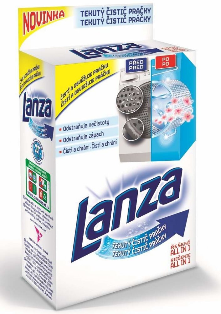 Abyste při prvním čištění vnitřních částí vaší pračky dosáhli lepšího výsledku, spusťte dva rychlé cykly s prázdnou pračkou při teplotě 60 °C a při obou cyklech použijte jednu celou lahvičku přípravku Lanza tekutý čistič pračky.