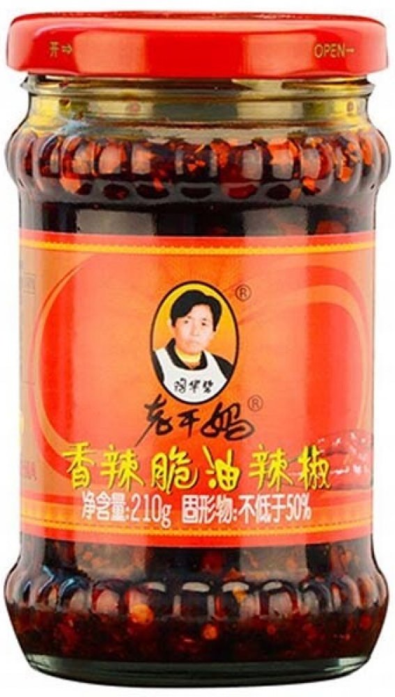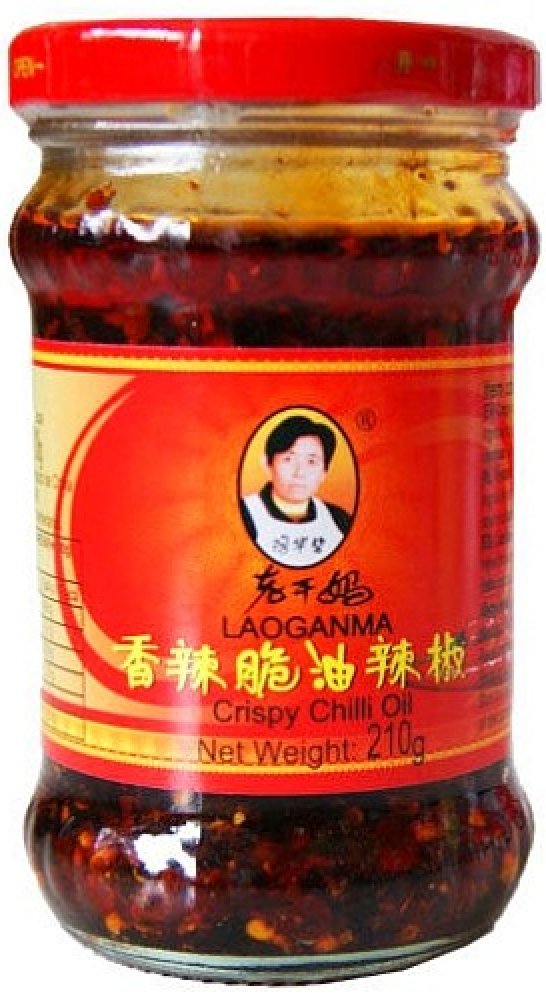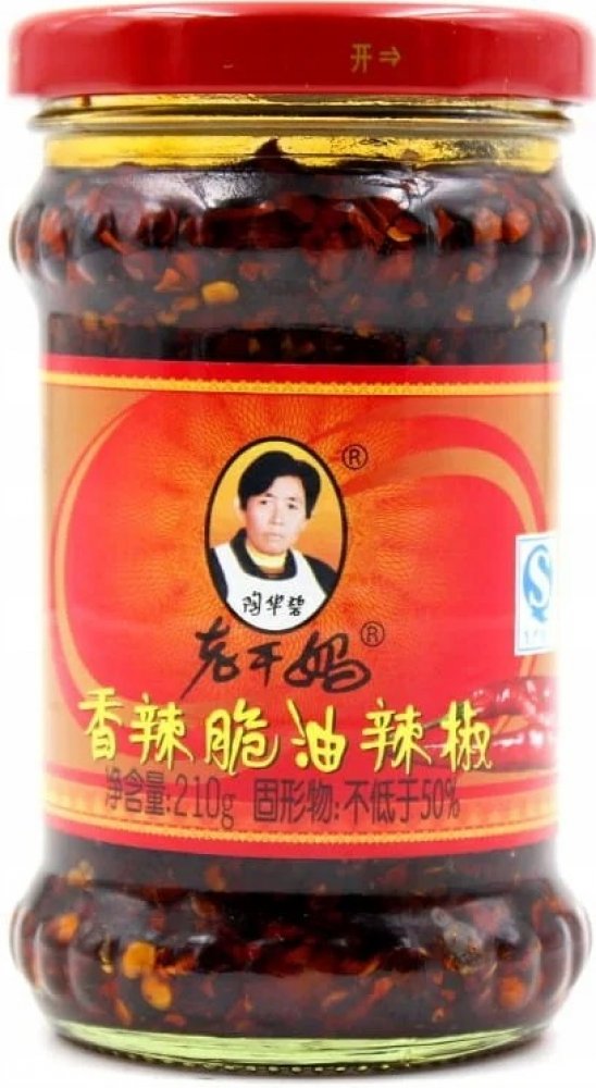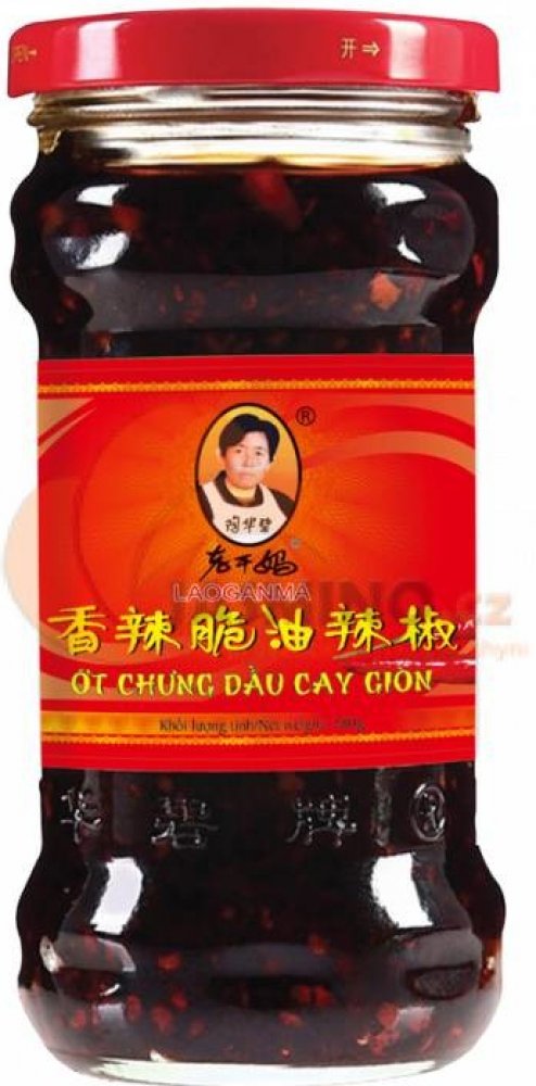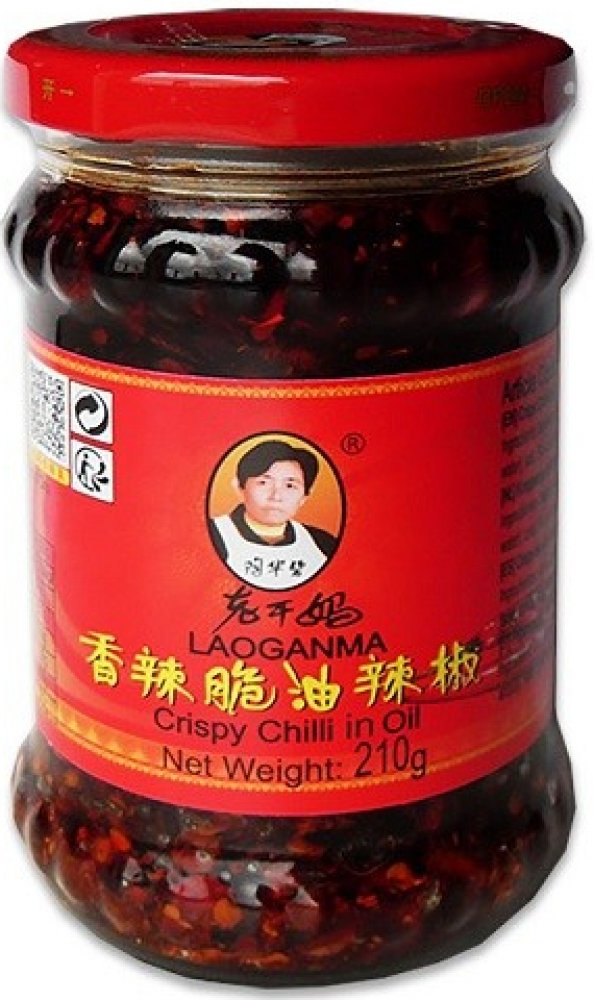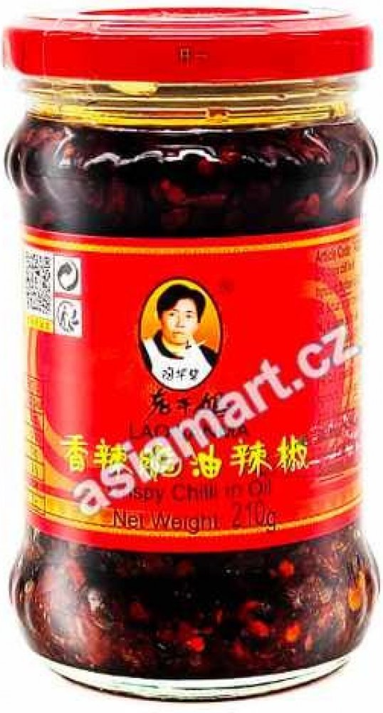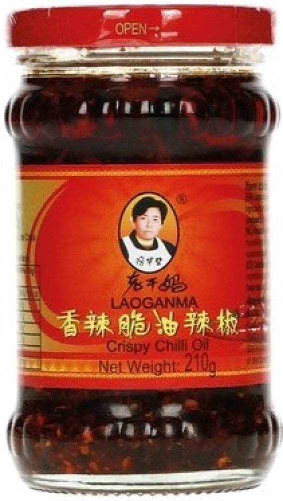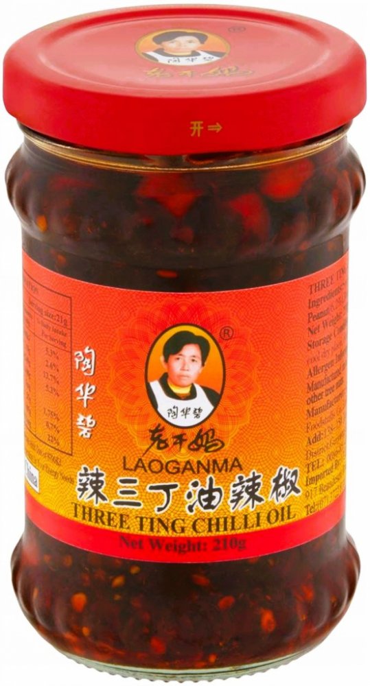 Složení: Sójový olej (40%), chilli paprička (35%), cibule (8%), fermentované sójové boby (sójové boby, voda), sůl, cukr, sečuánský červený pepř, zvýrazňovač chuti (E621). Alergeny: sója, arašídy.Nutriční hodnoty na 100g: Energie 2944kJ/704kcal / Tuk 68,6g z toho nasycené 6,1g / Sacharidy 10,6g z toho cukr 3,7g / Protein 7g / Sůl 2,3g. Skladování: Skladujte v suchu a temnu. Po otevření skladujte v lednici. Země původu: Čína.