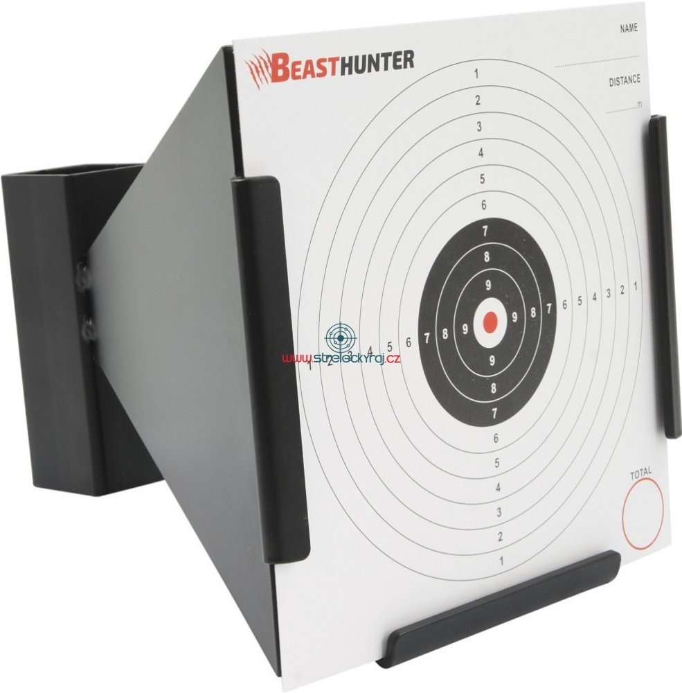 Lapač Beast Hunter Pyramid MAX, 17x17 / 3mm určený určený pro standardní papírový terč 17x17 cm a střelbu olověnými diabolkami, či broky. Plech lapače je zesílený na tloušťkou 3mm, což umožňuje využití také u silnějších vzduchovek s výkonem nad 16J. Výhodou lapače je větší bezpečnost, kdy se diabolky, nebo broky zastavují o zadní šikmou stěnu. Olovo lze snadno sbírat a recyklovat a papír z terče téměř neznečišťujě okolí. Lapač je možné zavěsit, nebo položit na rovnou plochu. Výhodné je pevné uložení. Vhodný pro sportovní, tréninkovou a zábavnou střelbu. Hmotnost: 2000 g.