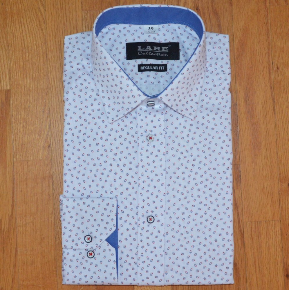 Košile s dlouhým rukávem od značky LARE Collection v bílé barvě s červeným a tmavě modrým potiskem. Košile je uzpůsobena klasickému zapínání na knoflíček či na manžetový knoflík. Zapínání na bílé knoflíčky s tmavým ohraničením. Má užší třih Slim Fit. Ušita z 80 % bavlny a 20 % polyesteru.