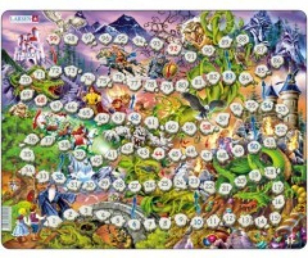 Deskové puzzle pro děti 40 dílků - LARSEN - Hra Hadi a žebříky. Kdo bude rychleji v cíli? Poskládej si puzzle s čarovnou cestou a můžeš si zahrát zábavnou hru Hadi a žebříky. Postup hry je velmi jednoduchý. Házej kostkou a postupuj po cestičce. V případě, že se zastavíš na modrém políčku můžeš si zkrátit cestu směrem nahoru. Pozor, nestoupej na červená políčka, ty tě totiž vrátí o řadu dolů.