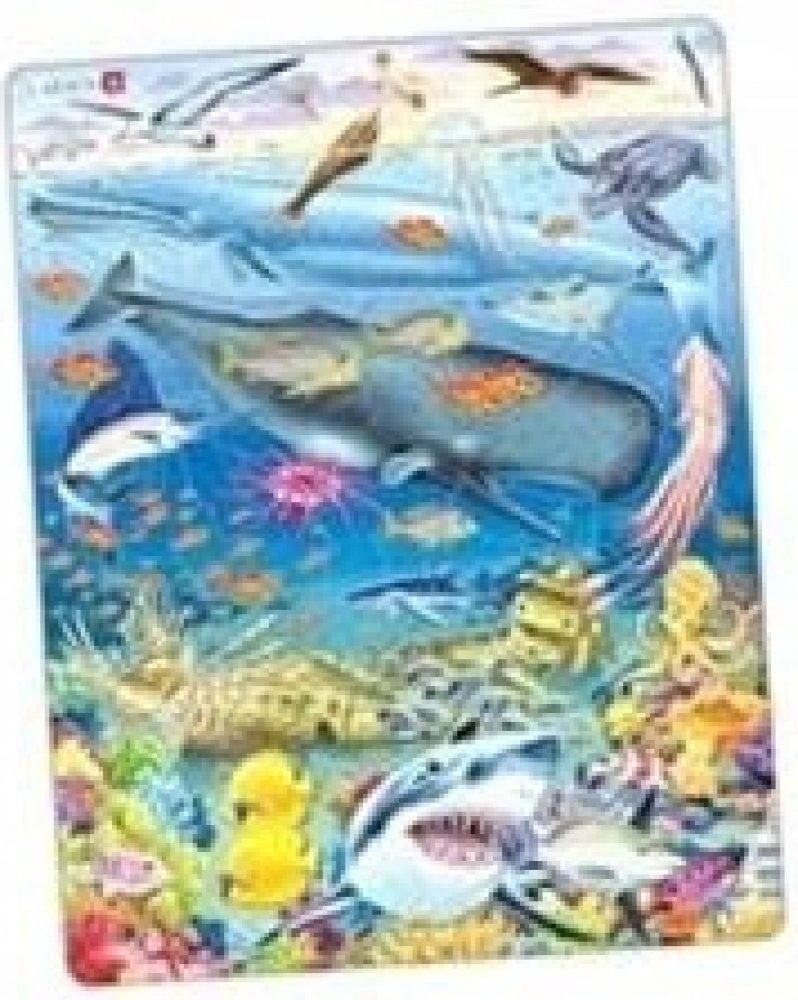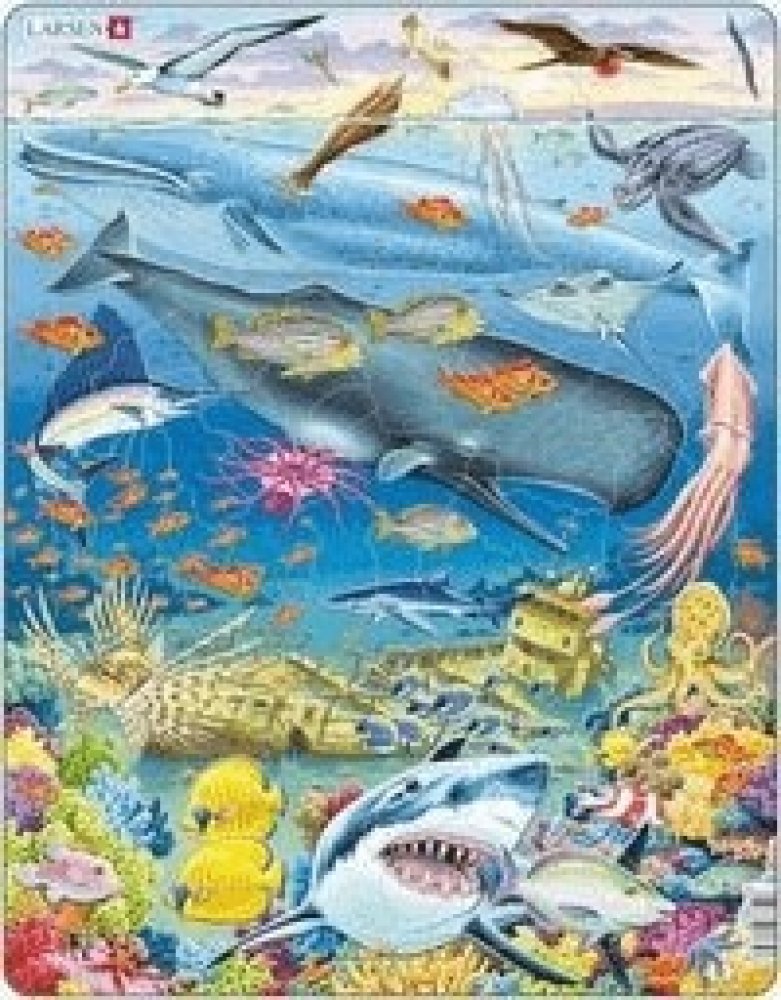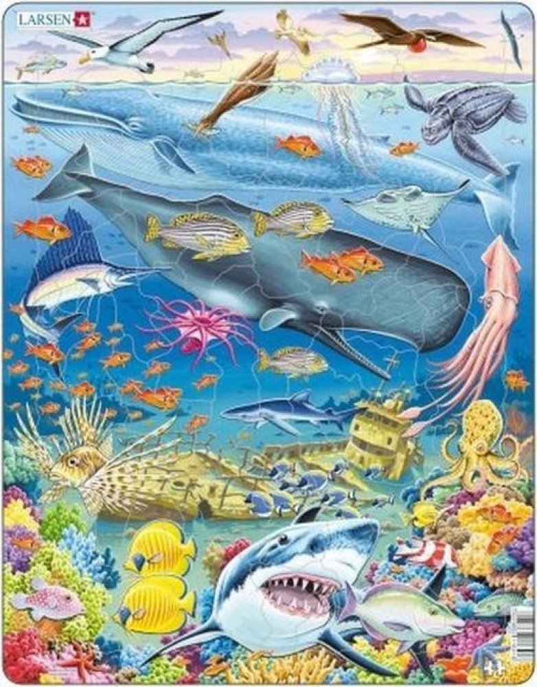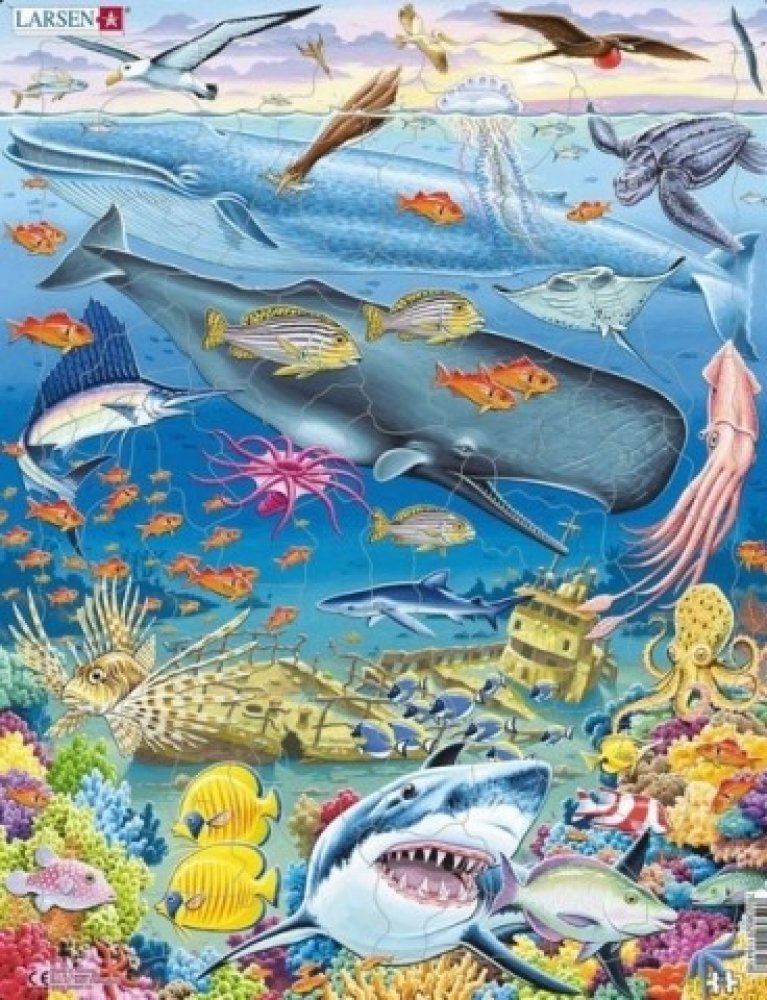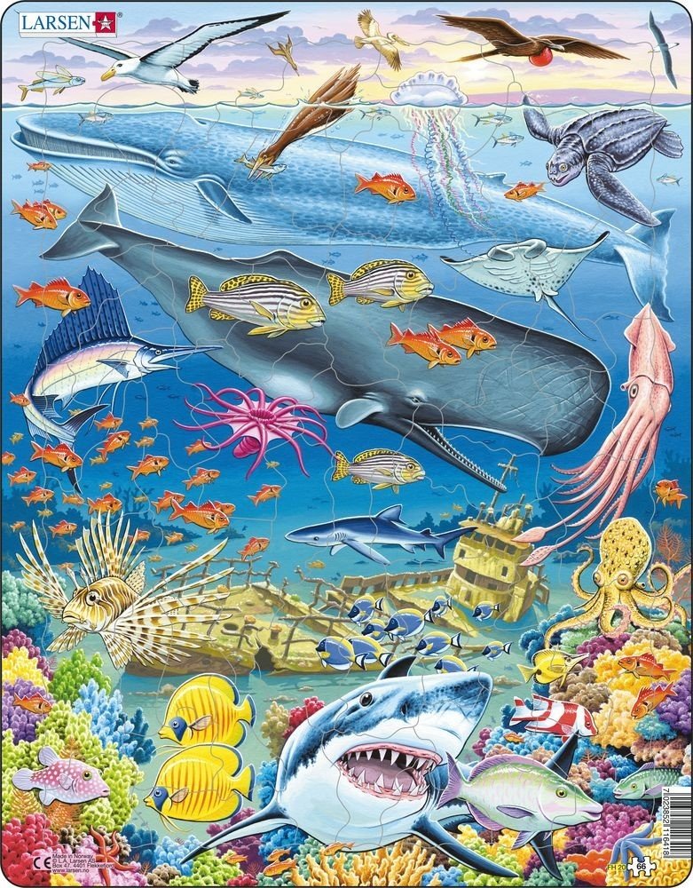 "Explore in the ocean, diving in motion, while the fish are devoting full time to floating... Under the Sea." This impeccable whale reef puzzle features 66 pieces, best suited for the older children. This Pacific Ocean puzzle is beautifully illustrated with eye-catching colours, focusing on creative corals and all fishes down under. The puzzle features flying fish, wandering albatross, a pelican, lesser frigate, a squirrelfish, black-browed albatross, the great blue whale, jumping jellyfish, yellowfin tuna, a leatherback turtle, manta ray, a giant squid, zebrafish, blue shark, blue surgeonfish, an octopus, a spotted pufferfish, 2 parrotfishes, the long-nosed butterflyfish and the great white shark surrounded by starfishes and corals. Can you identify all the fishes? Or are there some hiding amongst the corals. with 66 pieces