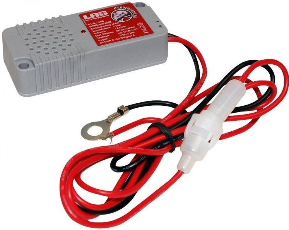 Elektronický plašič kun a jiných hlodavců od německé firmy LAS. Specifikace: napájení 12 V akustický tlak max. 110 dB frekvence ultrazvukového signálu 23 kHz úhel vyzařování ultrazvukového signálu: cca 160 stupňů odběr proudu odpuzovače: (průměrně) menší než 2mA velmi malý příkon: cca 0,025W rozměry: délka 83 x šířka 35 x výška 19 mm provozní teplota: - 40 až + 80 °C hmotnost: 97g Špičkový ultrazvukový odpuzovač - plašič kun a hlodavců pro automobily, zemědělské stroje, karavany, lodě apod. Ultrazvukový odpuzovač - plašič vytváří ultrazvukové pulzy, které jsou velmi nepříjemné pro drobné škůdce. Odpuzovač - plašič působí především na kuny, lasičky a drobné hlodavce. Chrání tak kabely a zejména plastové součásti umístěné v motorovém prostoru automobilu před zničením. Odpuzovač - plašič je vhodný také pro ochranu zemědělských strojů, lodí, karavanů apod. Indikace provozu LED diodou. Odpuzovač (plašič) do auta je zcela odolný proti nečistotám a vodě které se vyskytují v motorovém prostoru automobilu. Vestavěná ochranná pojistka.