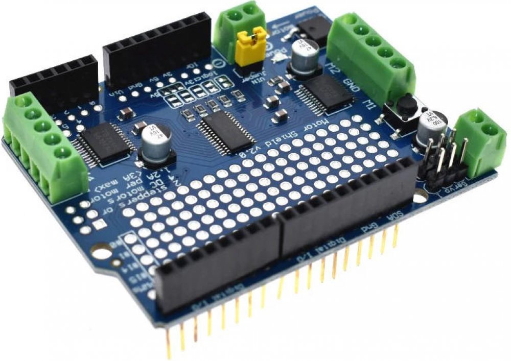 Nová verze motorového shieldu pro Arduino UNO, Leonardo, ADK/Mega R3, Due, Diecimila a Duemilanove umožňuje ovládat 2 krokové motory, nebo 4 DC motory společně s dvěma servo motory. Komunikace se základní deskou Arduino probíhá pomocí I2C sběrnice a pro ovládání jsou tedy potřeba pouze dva datové piny. Další dva piny jsou potřebné pro řízení dvou serv. Serva jsou řízena přímo ze základní desky Arduino a jsou z ní i napájeny. Celkový počet datových pinů je tedy 4. To je značná úspora pinů na Arduino desce a navíc díky tomu, že pro komunikaci bylo vybráno rozhraní I2C, lze shield kombinovat s jinými různými shieldy. Shield lze také stohovat a tím ovládat až 64 krokových motorů, nebo 128 DC motorů. Na desce je 5 propojek pro výběr I2C adresy. Jelikož jsou servomotory řízeny napřímo ze základní desky Arduino, jsou v každém případě k dispozici pouze dva a to na pinech D9 a D10. Základním obvodem je PCA9685, který slouží pro komunikaci rozhraním I2C s deskou Arduino a pomocí dvou driverů TB6612 ovládá krokové a DC motory. Specifikace: Napětí log. obvodu: 4.5–5.5VDC Napětí motorů: 6-12VDC Proudový odběr napájení motoru: 1,2A (3A nárazově) Napětí serv: 5V - ze stabilizátoru na základní desce Arduino! Součásti dodávky: 1ks Arduino I2C motor shield TB6612 + PCA9685 Poznámka: Tento výrobek není samostatně funkčním celkem a může vyžadovat odbornou montáž. Fotografie výrobků jsou pouze ilustracemi na ukázku a někdy se mohou lišit od skutečného vzhledu předmětu. Avšak toto nemění jejích základní vlastnosti. Po nasazení shieldu, prosím, zkontrolujte, zda se vývody ze spodní strany nedotýkají pouzder součástek na spodní desce! Mohlo by to způsobit zkrat a zničení shieldu, nebo i základní desky. Na takto požkozené zboží se záruka nevztahuje!