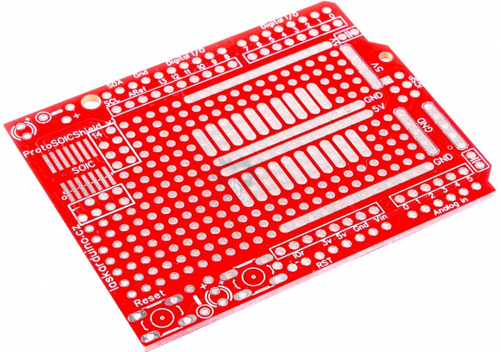 LaskaKit Arduino UNO PCB prototypová deska Shield SOIC Po letování pinů můžeš to nasádít přímo na Arduino UNO, MEGA či Leonardo. Kvalitní provedení, výborná pro prototypy. Specifikace: Na DPS SOIC místo pro IC misto pro: 1 tlačítko reset, 1 tlačítko uživatelské a 2 LED diody Materiál: FR-4 (skleněné vlákno) Barva: Červená nebo Bílá Mřížka: 0.1"(2.54mm) Tloušťka: 1.6mm Průměr otvoru: 1mm Velikost:7...